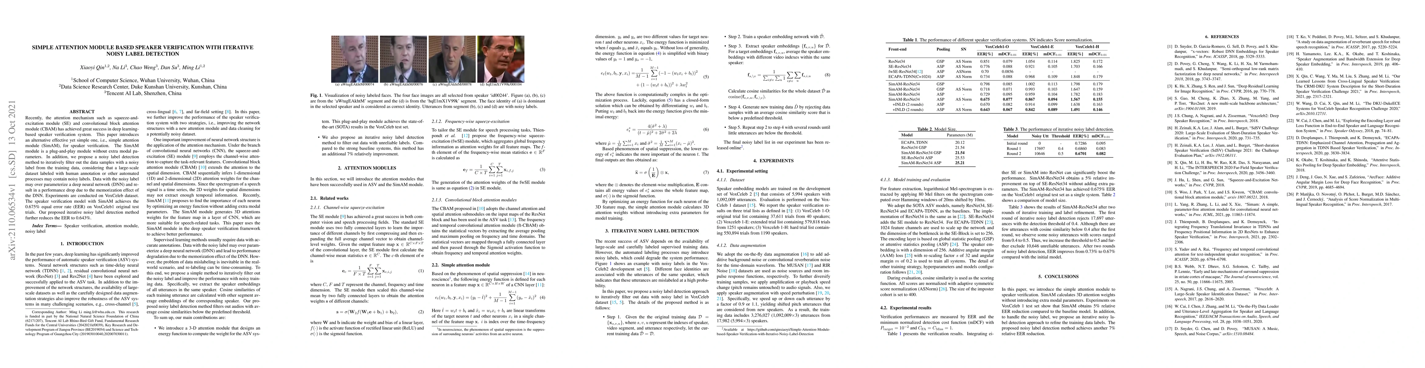 This paper proposes a simple attention module (SimAM) for speaker verification, achieving a 0.675% equal error rate (EER) on the VoxCeleb dataset. Additionally, an iterative noisy label detection method is introduced to filter out noisy labels, further reducing the EER to 0.643%.