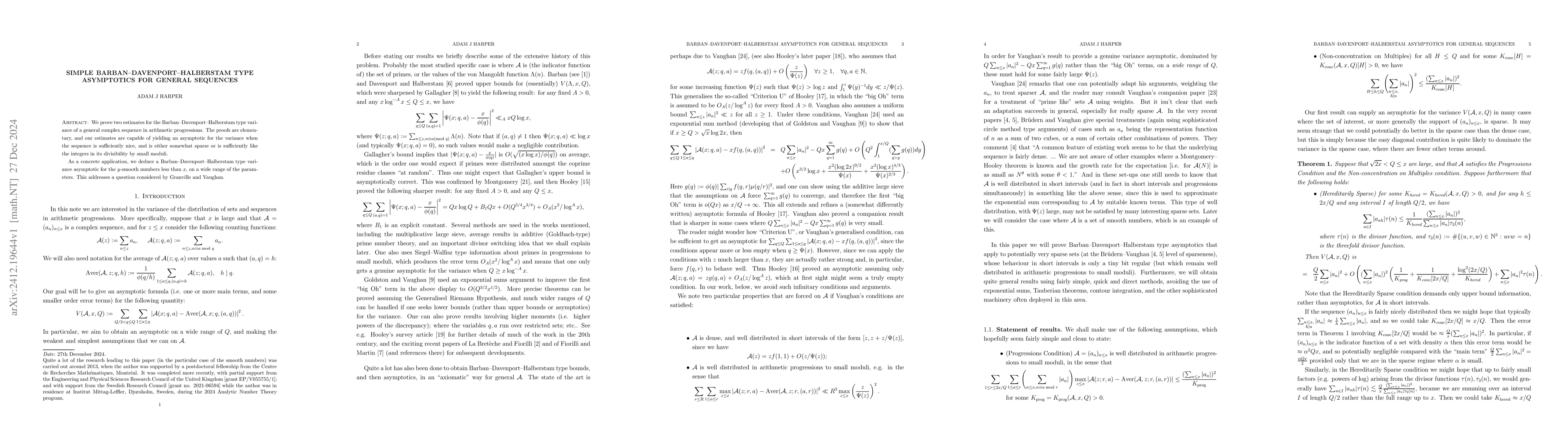 We prove two estimates for the Barban--Davenport--Halberstam type variance of a general complex sequence in arithmetic progressions. The proofs are elementary, and our estimates are capable of yielding an asymptotic for the variance when the sequence is sufficiently nice, and is either somewhat sparse or is sufficiently like the integers in its divisibility by small moduli. As a concrete application, we deduce a Barban--Davenport--Halberstam type variance asymptotic for the $y$-smooth numbers less than $x$, on a wide range of the parameters. This addresses a question considered by Granville and Vaughan.