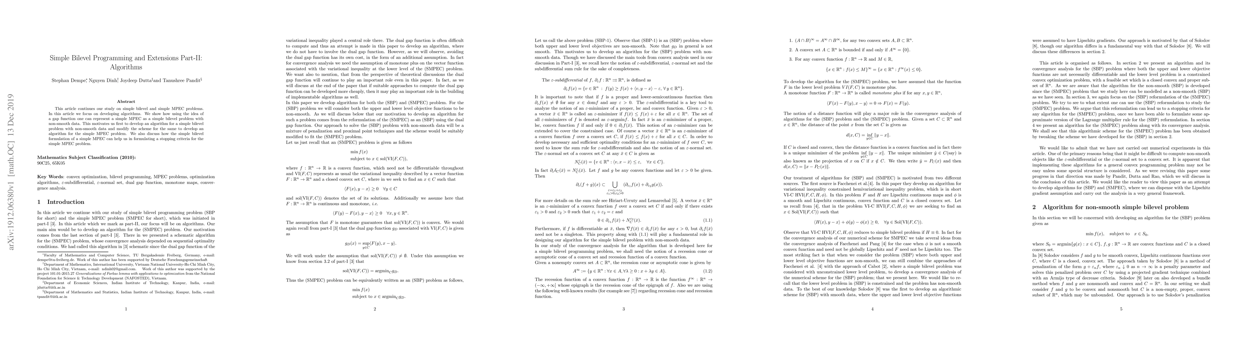 This article continues our study on simple bilevel and simple MPEC problems. In this article we focus on developing algorithms. We show how using the idea of a gap function one can represent a simple MPEC as a simple bilevel problem with non-smooth data. This motivates us first to develop an algorithm for a simple bilevel problem with non-smooth data and modify the scheme for the same to develop an algorithm for the simple MPEC problem. We also discuss how the simple bilevel formulation of a simple MPEC can help us in formulating a stopping criteria for the simple MPEC problem