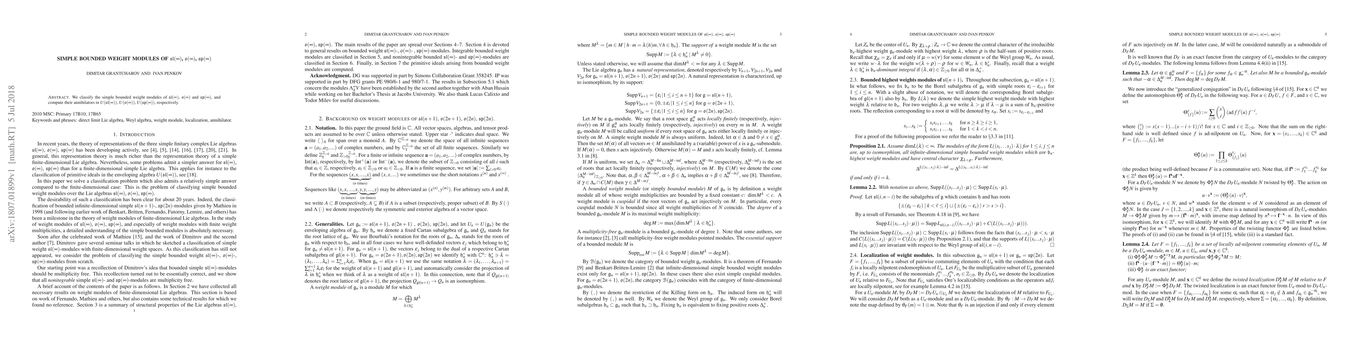 We classify the simple bounded weight modules of ${\mathfrak{sl}(\infty})$, ${\mathfrak{o}(\infty)}$ and ${\mathfrak{sp}(\infty)}$, and compute their annihilators in $U({\mathfrak{sl}(\infty}))$, $U({\mathfrak{o}(\infty))}$, $U({\mathfrak{sp}(\infty))}$, respectively.