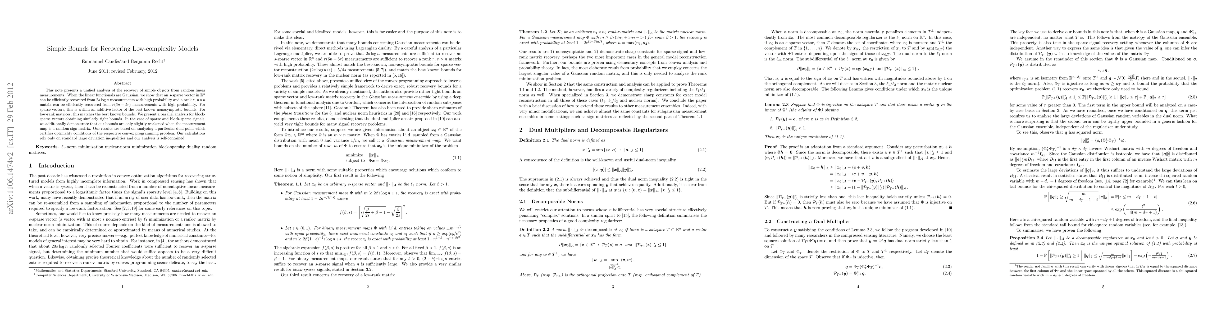 This paper establishes efficient recovery bounds for simple objects from random linear measurements, including sparse vectors and low-rank matrices with high probability.