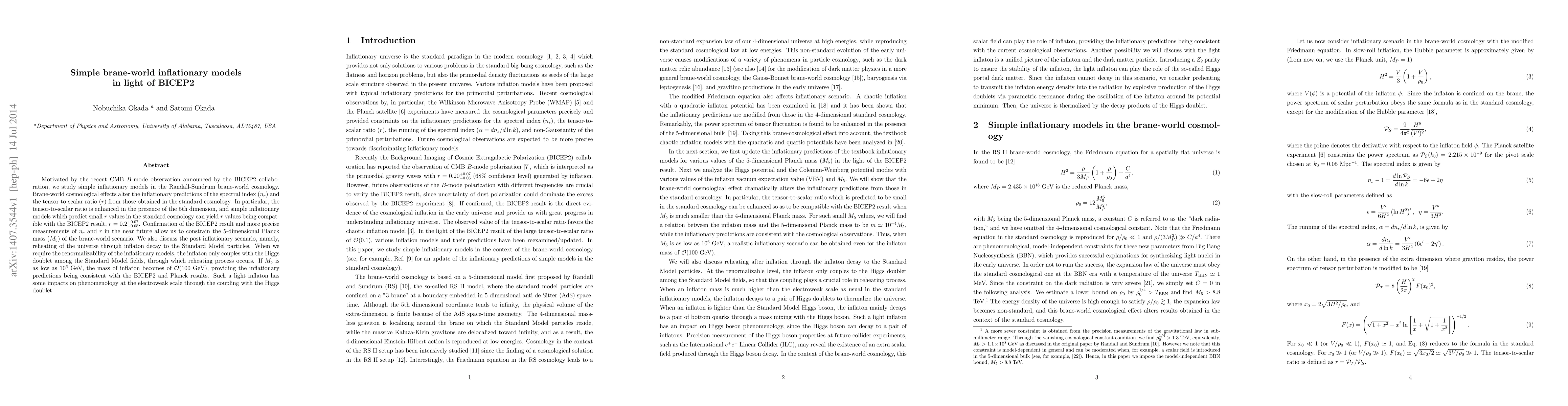 Motivated by the recent CMB $B$-mode observation announced by the BICEP2 collaboration, we study simple inflationary models in the Randall-Sundrum brane-world cosmology. Brane-world cosmological effects alter the inflationary predictions of the spectral index ($n_s$) and the tensor-to-scalar ratio ($r$) from those obtained in the standard cosmology. In particular, the tensor-to-scalar ratio is enhanced in the presence of the 5th dimension, and simple inflationary models which predict small $r$ values in the standard cosmology can yield $r$ values being compatible with the BICEP2 result, $r=0.2^{+0.07}_{-0.05}$. Confirmation of the BICEP2 result and more precise measurements of $n_s$ and $r$ in the near future allow us to constrain the 5-dimensional Planck mass ($M_5$) of the brane-world scenario. We also discuss the post inflationary scenario, namely, reheating of the universe through inflaton decay to the Standard Model particles. When we require the renormalizability of the inflationary models, the inflaton only couples with the Higgs doublet among the Standard Model fields, through which reheating process occurs. If $M_5$ is as low as $10^6$ GeV, the mass of inflaton becomes of ${\cal O}$(100 GeV), providing the inflationary predictions being consistent with the BICEP2 and Planck results. Such a light inflaton has some impacts on phenomenology at the electroweak scale through the coupling with the Higgs doublet.