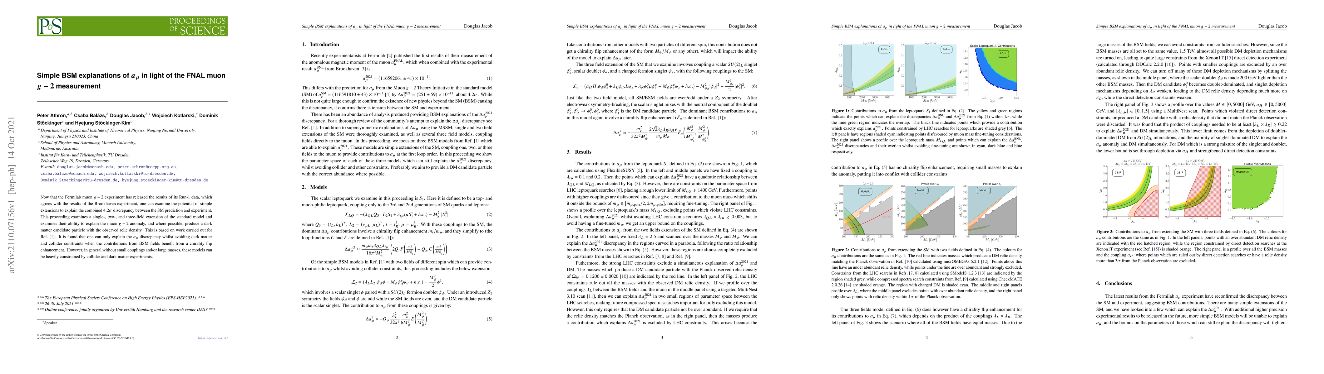 Now that the Fermilab muon $g-2$ experiment has released the results of its Run-1 data, which agrees with the results of the Brookhaven experiment, one can examine the potential of simple extensions to explain the combined $4.2\sigma$ discrepancy between the SM prediction and experiment. This proceeding examines a single-, two-, and three-field extension of the standard model and examines their ability to explain the muon $g-2$ anomaly, and where possible, produce a dark matter candidate particle with the observed relic density. This is based on work carried out for Ref. [1]. It is found that one can only explain the $a_\mu$ discrepancy whilst avoiding dark matter and collider constraints when the contributions from BSM fields benefit from a chirality flip enhancement. However, in general without small couplings and/or large masses, these models can be heavily constrained by collider and dark matter experiments.