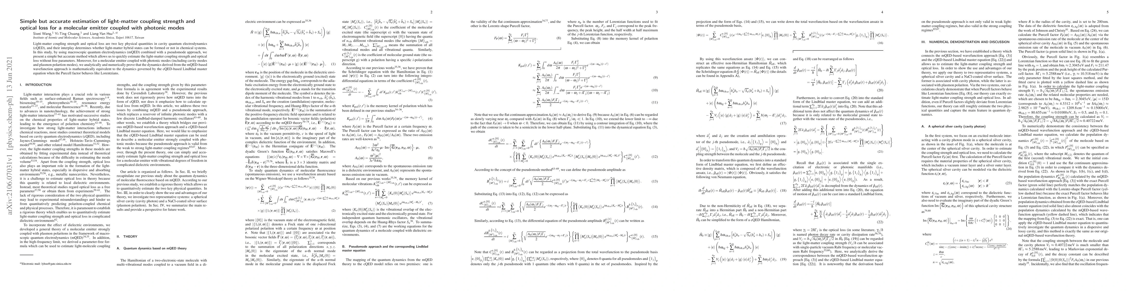 Light-matter coupling strength and optical loss are two key physical quantities in cavity quantum electrodynamics (cQED), and their interplay determines whether light-matter hybrid states can be formed or not in chemical systems. In this study, by using macroscopic quantum electrodynamics (mQED) combined with a pseudomode approach, we present a simple but accurate method which allows us to quickly estimate the light-matter coupling strength and optical loss without free parameters. Moreover, for a molecular emitter coupled with photonic modes (including cavity modes and plasmon polartion modes), we analytically and numerically prove that the dynamics derived from the mQED-based wavefunction approach is mathematically equivalent to the dynamics governed by the cQED-based Lindblad master equation when the Purcell factor behaves like Lorentzians.