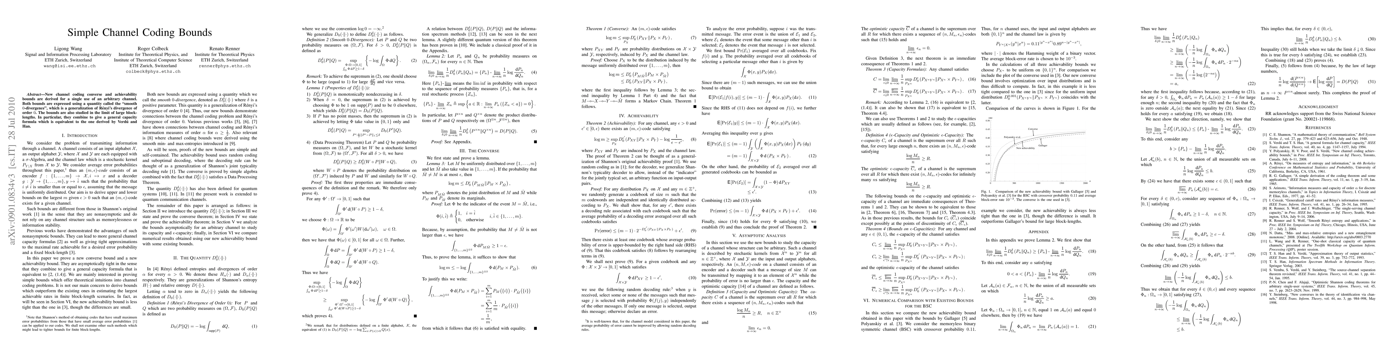New channel coding converse and achievability bounds are derived for a single use of an arbitrary channel. Both bounds are expressed using a quantity called the "smooth 0-divergence", which is a generalization of Renyi's divergence of order 0. The bounds are also studied in the limit of large block-lengths. In particular, they combine to give a general capacity formula which is equivalent to the one derived by Verdu and Han.