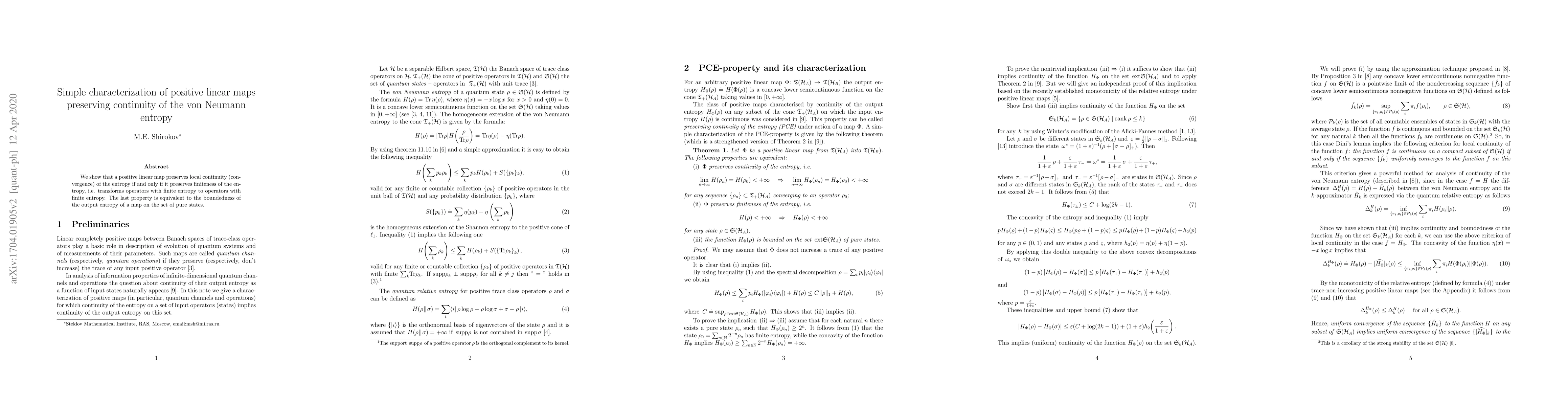 Summary: A positive linear map preserves the local continuity of von Neumann entropy if and only if it maintains finiteness of entropy, which is equivalent to the boundedness of output entropy on pure states. This establishes a simple characterization of such maps.