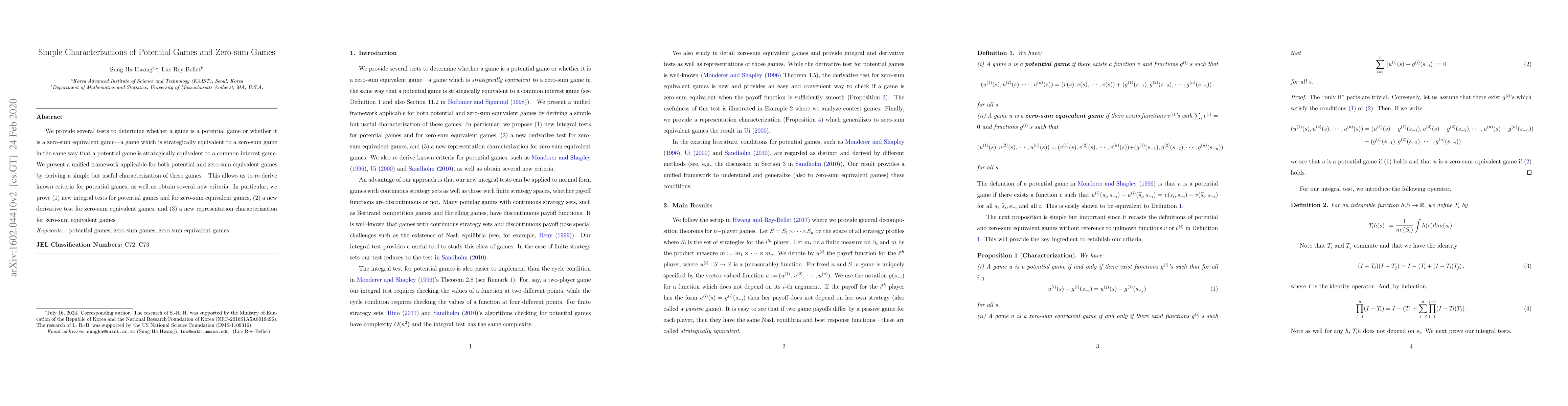 The paper presents a unified framework for characterizing potential games and zero-sum equivalent games using integral and derivative tests, derived from a simple but useful characterization applicable to both game types.
