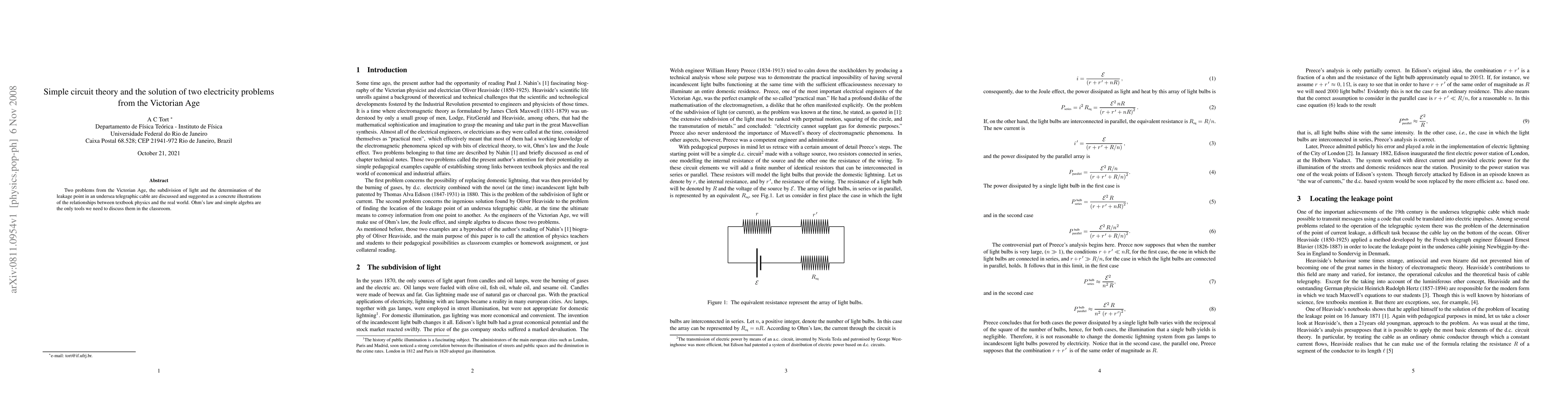 Two problems from the Victorian Age, the subdivision of light and the determination of the leakage point in an undersea telegraphic cable are discussed and suggested as a concrete illustrations of the relationships between textbook physics and the real world. Ohm's law and simple algebra are the only tools we need to discuss them in the classroom.