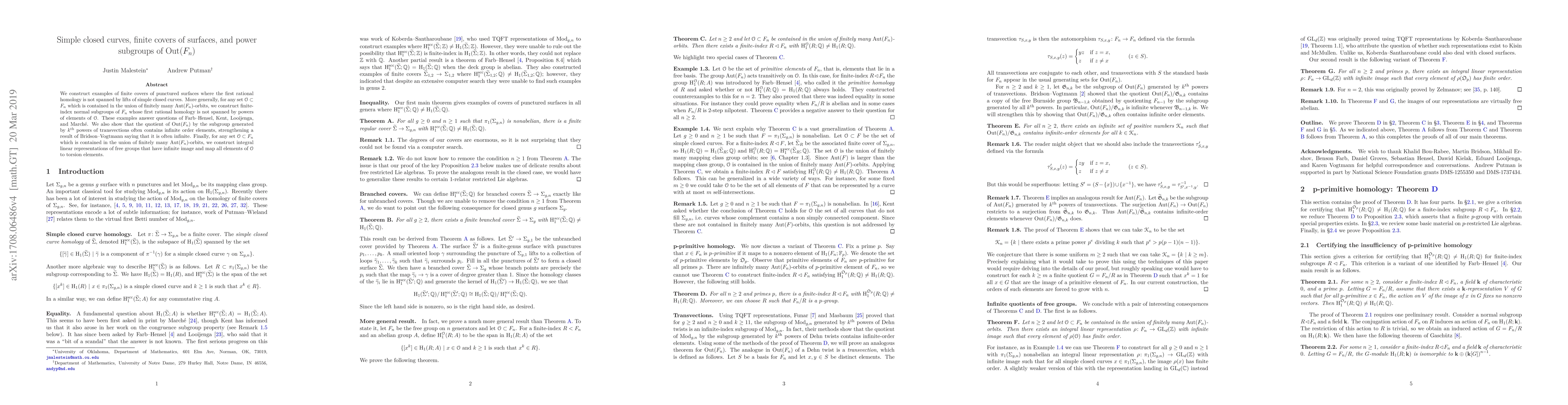 This paper constructs finite covers of punctured surfaces where the first rational homology is not spanned by simple closed curves. It also shows that certain subgroups of $Out(F_n)$ generated by kth powers of transvections often contain infinite order elements, and provides integral linear representations of free groups mapping specified sets to torsion elements.