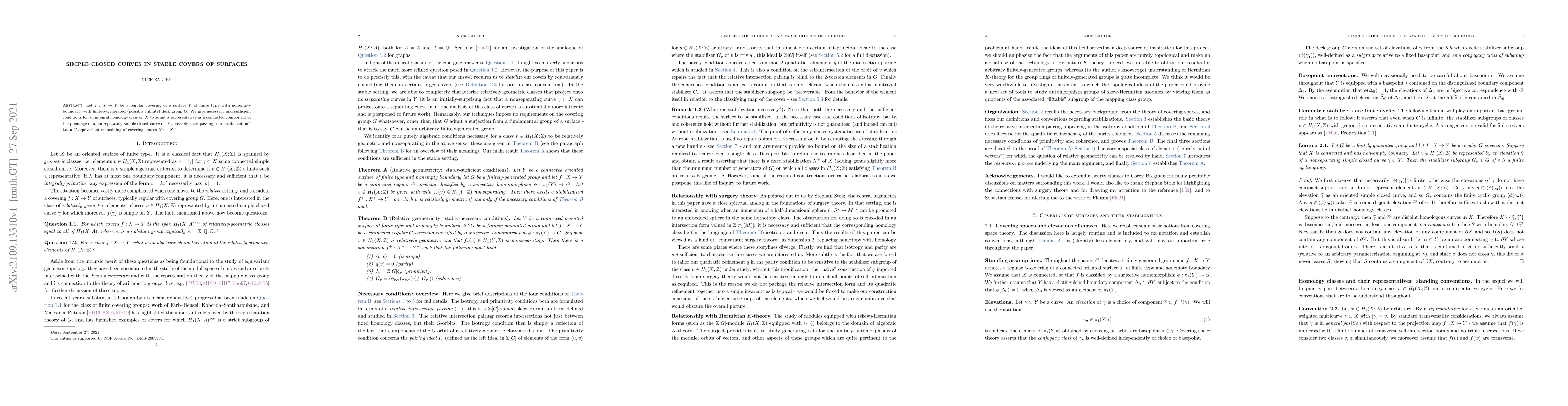 Let $f: X \to Y$ be a regular covering of a surface $Y$ of finite type with nonempty boundary, with finitely-generated (possibly infinite) deck group $G$. We give necessary and sufficient conditions for an integral homology class on $X$ to admit a representative as a connected component of the preimage of a nonseparating simple closed curve on $Y$, possibly after passing to a "stabilization", i.e. a $G$-equivariant embedding of covering spaces $X \hookrightarrow X^+$.