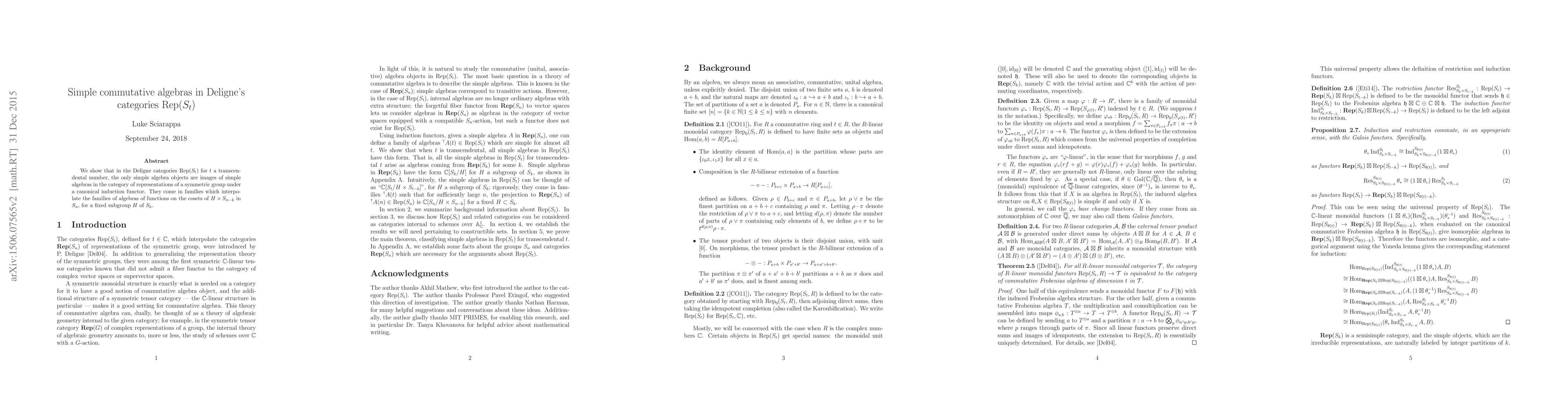 This paper demonstrates that in Deligne's categories Rep($S_t$) for transcendental $t$, the only simple algebra objects are induced from simple algebras in the representation category of symmetric groups. These simple objects interpolate the algebras of functions on cosets of subgroups in symmetric groups.