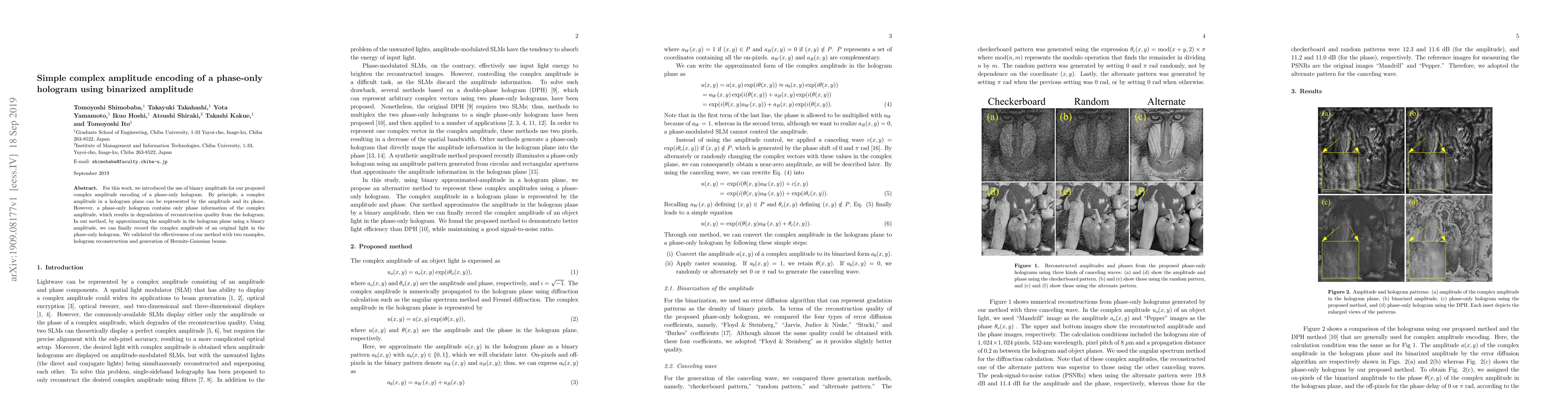 This paper proposes a method to encode complex amplitude information in a phase-only hologram using a binarized amplitude approximation. The method aims to improve reconstruction quality by approximating the amplitude in the hologram plane, validated through hologram reconstruction and Hermite-Gaussian beam generation examples.