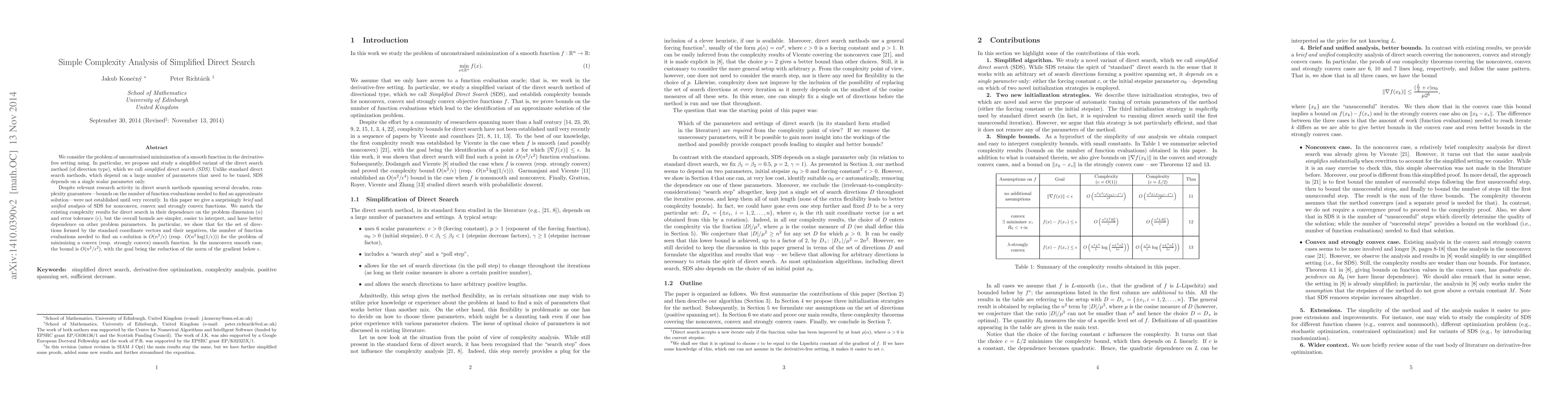 We consider the problem of unconstrained minimization of a smooth function in the derivative-free setting using. In particular, we propose and study a simplified variant of the direct search method (of direction type), which we call simplified direct search (SDS). Unlike standard direct search methods, which depend on a large number of parameters that need to be tuned, SDS depends on a single scalar parameter only. Despite relevant research activity in direct search methods spanning several decades, complexity guarantees---bounds on the number of function evaluations needed to find an approximate solution---were not established until very recently. In this paper we give a surprisingly brief and unified analysis of SDS for nonconvex, convex and strongly convex functions. We match the existing complexity results for direct search in their dependence on the problem dimension ($n$) and error tolerance ($\epsilon$), but the overall bounds are simpler, easier to interpret, and have better dependence on other problem parameters. In particular, we show that for the set of directions formed by the standard coordinate vectors and their negatives, the number of function evaluations needed to find an $\epsilon$-solution is $O(n^2 /\epsilon)$ (resp. $O(n^2 \log(1/\epsilon))$) for the problem of minimizing a convex (resp. strongly convex) smooth function. In the nonconvex smooth case, the bound is $O(n^2/\epsilon^2)$, with the goal being the reduction of the norm of the gradient below $\epsilon$.