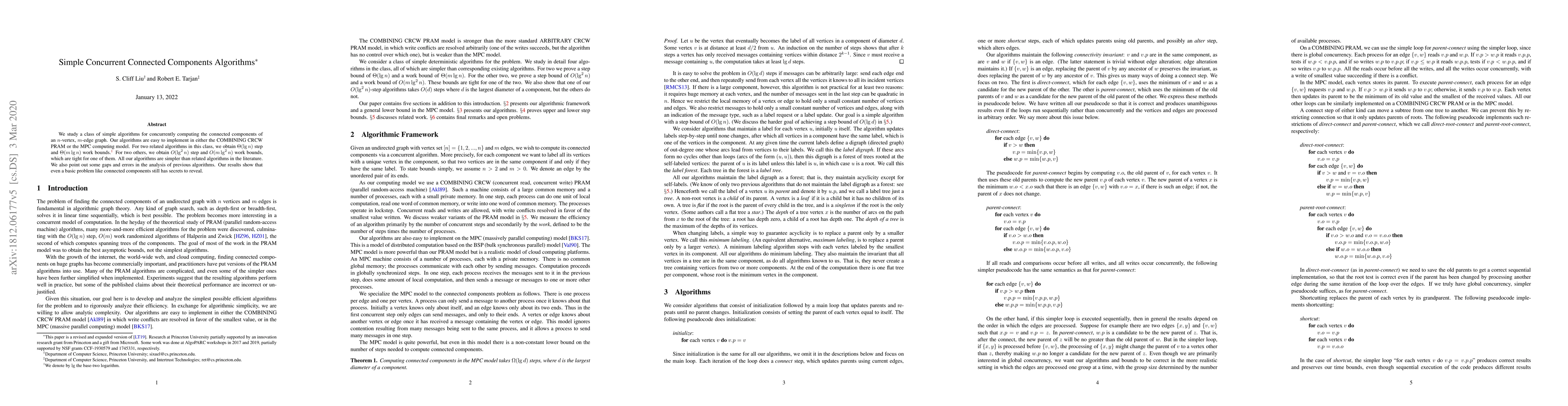This paper presents simple concurrent algorithms for computing connected components in graphs, achieving $\Theta(\lg n)$ steps and $\Theta(m \lg n)$ work for some, and $O(\lg^2 n)$ steps and $O(m \lg^2 n)$ work for others, demonstrating their efficiency and simplicity compared to previous methods. The authors also identify gaps in prior analyses.
