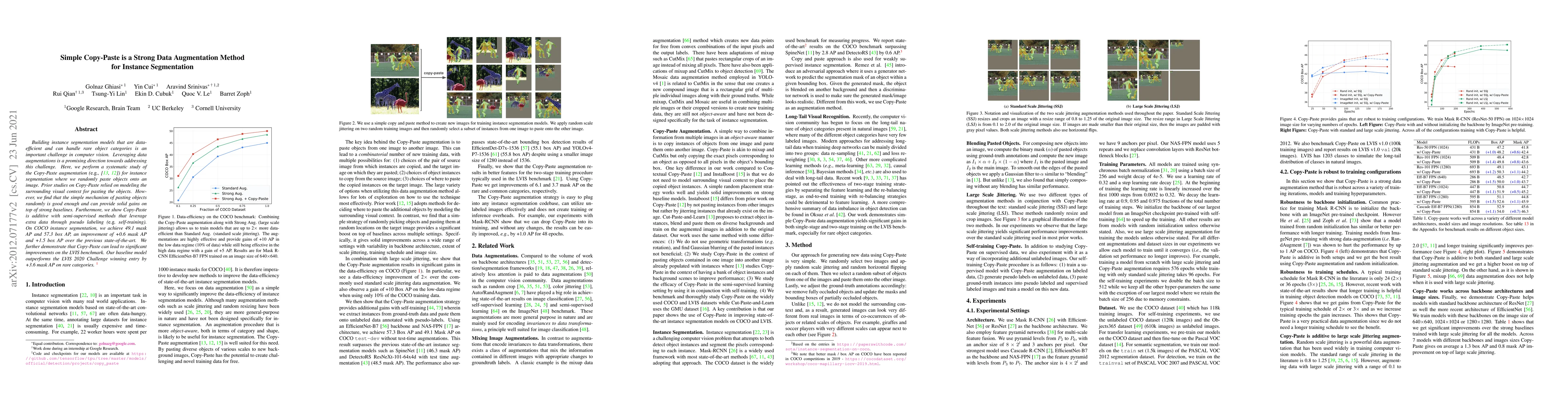 Building instance segmentation models that are data-efficient and can handle rare object categories is an important challenge in computer vision. Leveraging data augmentations is a promising direction towards addressing this challenge. Here, we perform a systematic study of the Copy-Paste augmentation ([13, 12]) for instance segmentation where we randomly paste objects onto an image. Prior studies on Copy-Paste relied on modeling the surrounding visual context for pasting the objects. However, we find that the simple mechanism of pasting objects randomly is good enough and can provide solid gains on top of strong baselines. Furthermore, we show Copy-Paste is additive with semi-supervised methods that leverage extra data through pseudo labeling (e.g. self-training). On COCO instance segmentation, we achieve 49.1 mask AP and 57.3 box AP, an improvement of +0.6 mask AP and +1.5 box AP over the previous state-of-the-art. We further demonstrate that Copy-Paste can lead to significant improvements on the LVIS benchmark. Our baseline model outperforms the LVIS 2020 Challenge winning entry by +3.6 mask AP on rare categories.