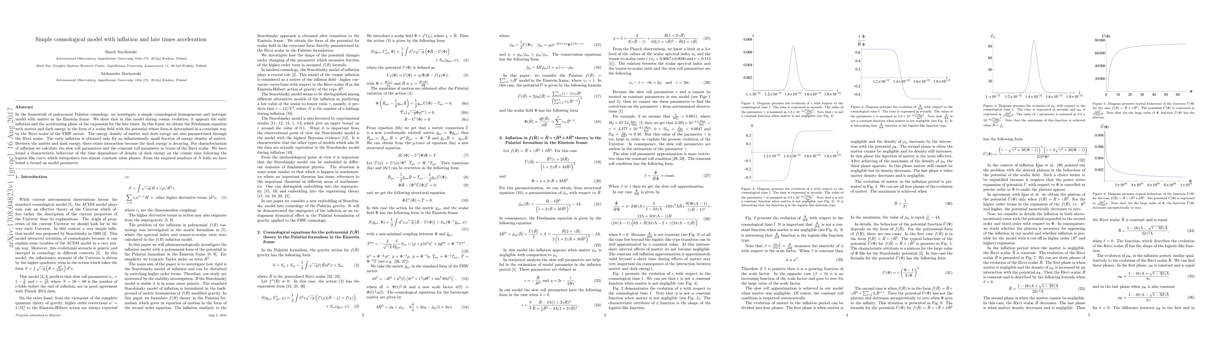 In the framework of polynomial Palatini cosmology, we investigate a simple cosmological homogeneous and isotropic model with matter in the Einstein frame. We show that in this model during cosmic evolution, it appears the early inflation and the accelerating phase of the expansion for the late times. In this frame we obtain the Friedmann equation with matter and dark energy in the form of a scalar field with the potential whose form is determined in a covariant way by the Ricci scalar of the FRW metric. The energy density of matter and dark energy are also parametrized through the Ricci scalar. The early inflation is obtained only for an infinitesimally small fraction of energy density of matter. Between the matter and dark energy, there exists interaction because the dark energy is decaying. For characterization of inflation we calculate the slow roll parameters and the constant roll parameter in terms of the Ricci scalar. We have found a characteristic behaviour of the time dependence of density of dark energy on the cosmic time following the logistic-like curve which interpolates two almost constant value phases. From the required numbers of $N$-folds we have found a bound on model parameter.