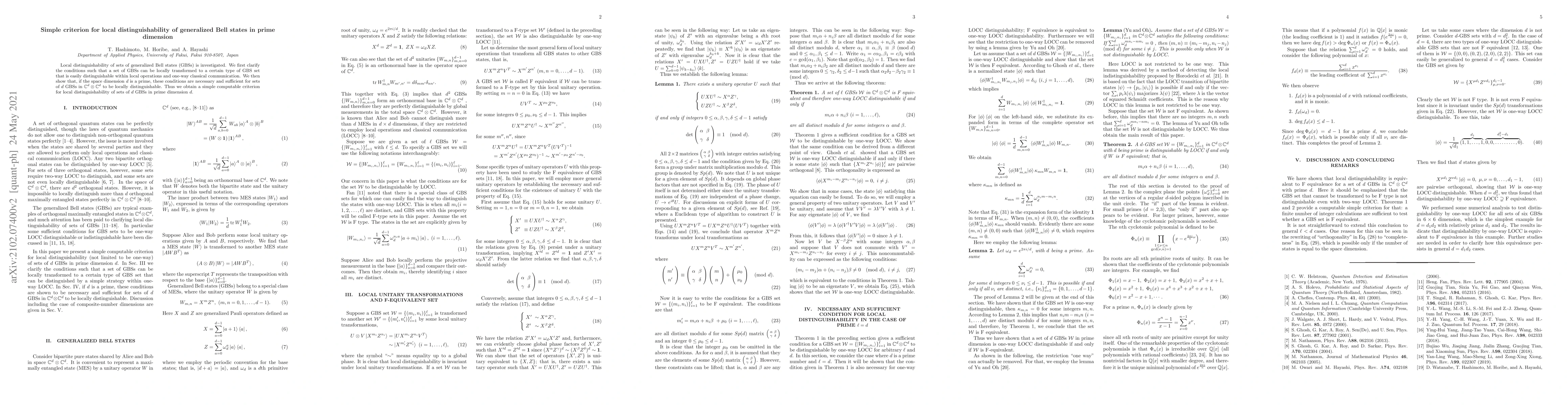 This paper provides a simple criterion for the local distinguishability of sets of generalized Bell states in prime dimensional spaces. It establishes that when the space dimension is prime, specific conditions are both necessary and sufficient for the local distinguishability of such sets using local operations and one-way classical communication.