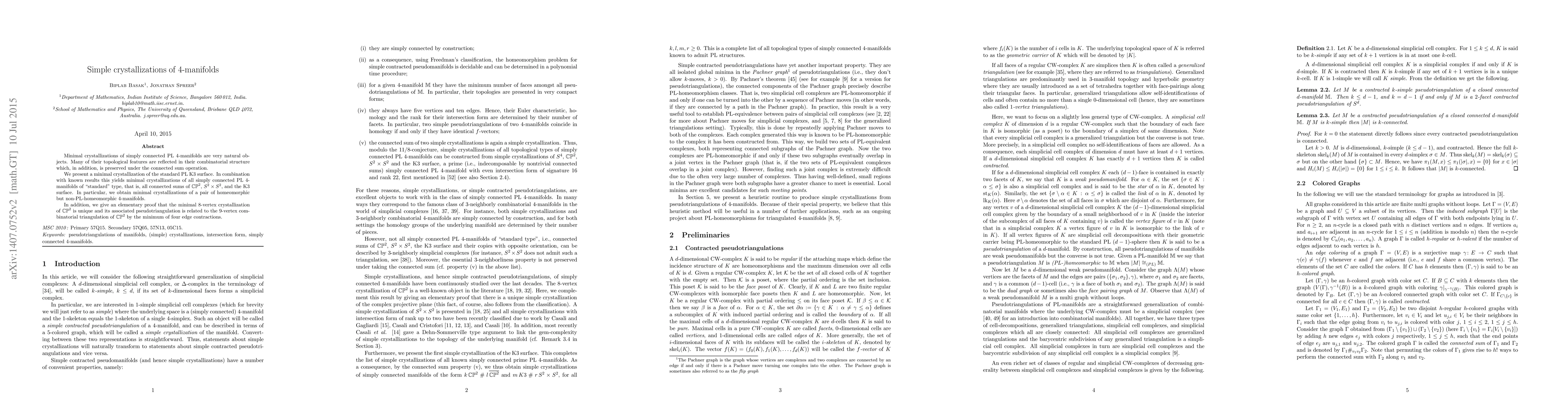 This paper explores minimal crystallizations of simply connected PL 4-manifolds, demonstrating their topological and combinatorial properties. It provides a crystallization for the K3 surface and uses this to construct crystallizations for all "standard" type 4-manifolds, including a pair of homeomorphic but non-PL-homeomorphic manifolds.
