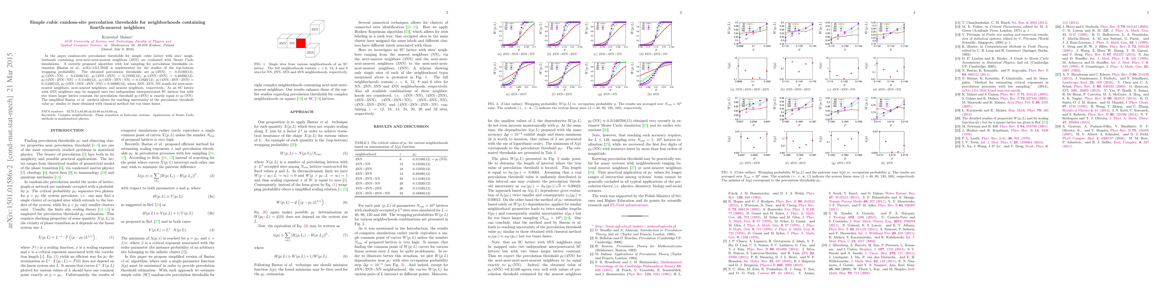 In the paper random-site percolation thresholds for simple cubic lattice with sites' neighborhoods containing next-next-next-nearest neighbors (4NN) are evaluated with Monte Carlo simulations. A recently proposed algorithm with low sampling for percolation thresholds estimation [Bastas et al., arXiv:1411.5834] is implemented for the studies of the top-bottom wrapping probability. The obtained percolation thresholds are $p_C(\text{4NN})=0.31160(12)$, $p_C(\text{4NN+NN})=0.15040(12)$, $p_C(\text{4NN+2NN})=0.15950(12)$, $p_C(\text{4NN+3NN})=0.20490(12)$, $p_C(\text{4NN+2NN+NN})=0.11440(12)$, $p_C(\text{4NN+3NN+NN})=0.11920(12)$, $p_C(\text{4NN+3NN+2NN})=0.11330(12)$, $p_C(\text{4NN+3NN+2NN+NN})=0.10000(12)$, where 3NN, 2NN, NN stands for next-next-nearest neighbors, next-nearest neighbors, and nearest neighbors, respectively. As an SC lattice with 4NN neighbors may be mapped onto two independent interpenetrated SC lattices but with two times larger lattice constant the percolation threshold $p_C$(4NN) is exactly equal to $p_C$(NN). The simplified Bastas et al. method allows for reaching uncertainty of the percolation threshold value $p_C$ similar to those obtained with classical method but ten times faster.
