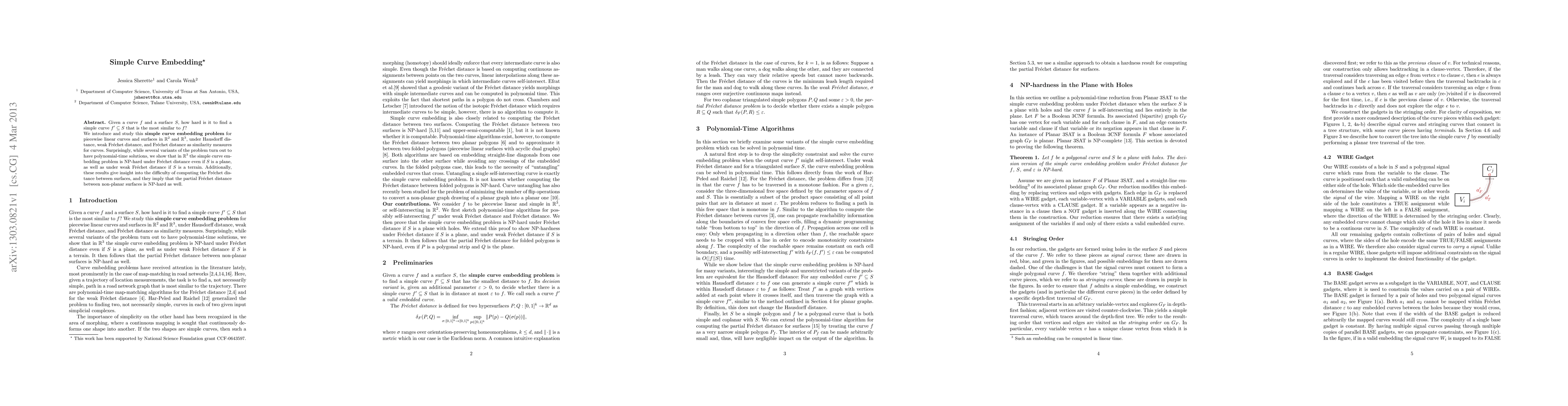This research introduces the 'simple curve embedding' problem, examining how difficult it is to find a simple curve on a surface similar to a given curve under various distance measures. Surprisingly, while some variants have polynomial-time solutions, the problem is NP-hard in R^3 under Frechet distance, even for simple surfaces like planes or terrains. This implies that computing similarities between certain non-planar surfaces is also NP-hard.