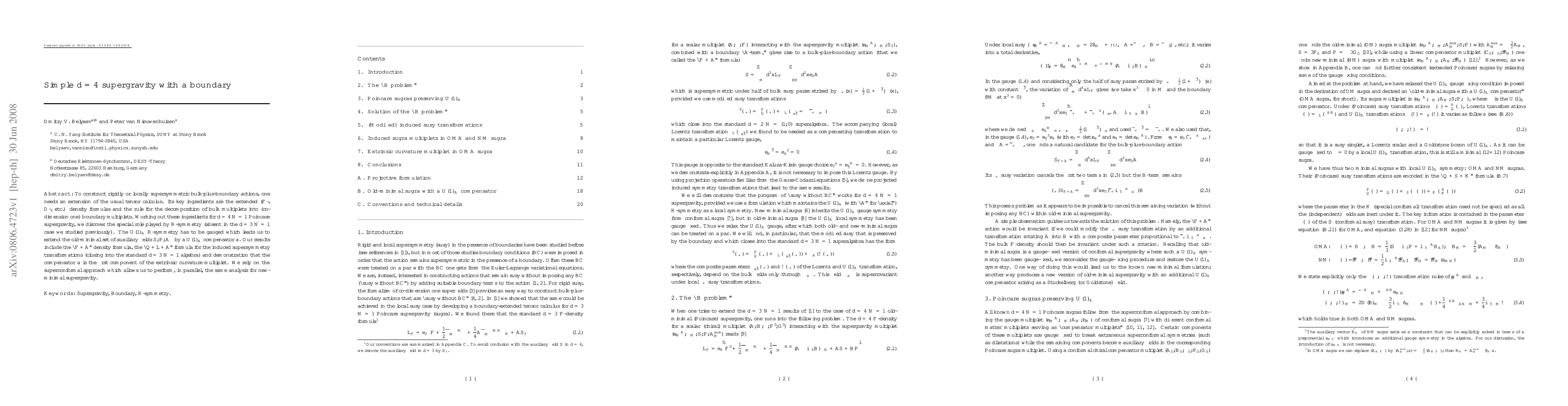This paper constructs rigidly or locally supersymmetric bulk-plus-boundary actions for d=4 N=1 Poincaré supergravity, discovering the special role of R-symmetry and requiring gauging of the $U(1)_A$ symmetry. It extends the old-minimal set of auxiliary fields and introduces new density formulas for induced supersymmetry transformations.