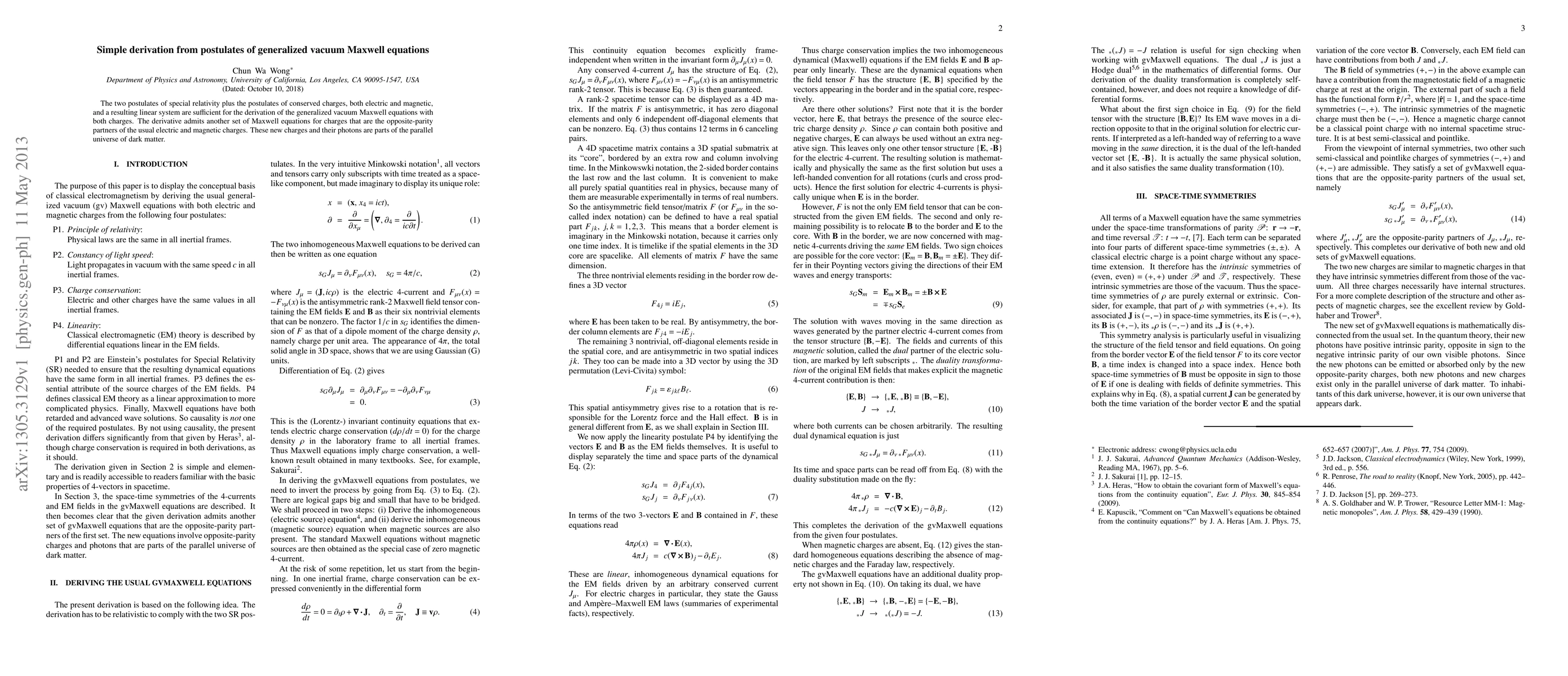 Summary: The paper derives generalized vacuum Maxwell equations from special relativity and conserved charge postulates, introducing a new set of equations for opposite-parity charges associated with dark matter.