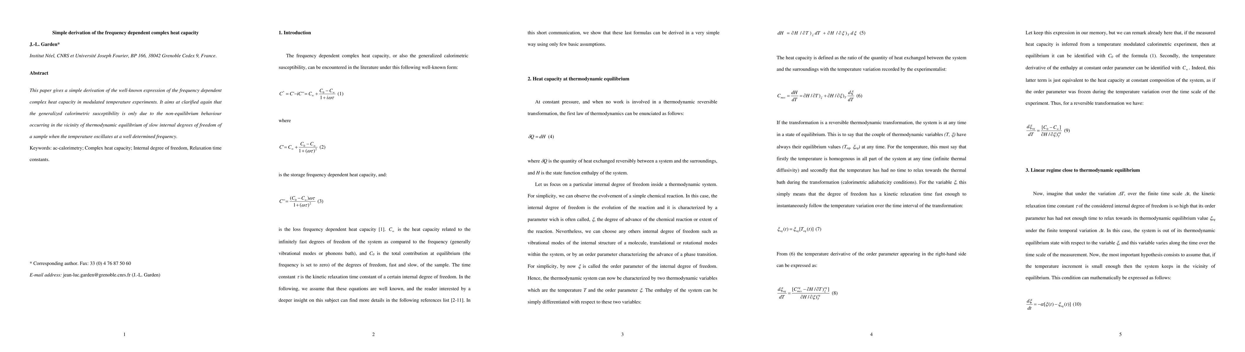 This paper gives a simple derivation of the well-known expression of the frequency dependent complex heat capacity in modulated temperature experiments. It aims at clarified again that the generalized calorimetric susceptibility is only due to the non-equilibrium behaviour occurring in the vicinity of thermodynamic equilibrium of slow internal degrees of freedom of a sample when the temperature oscillates at a well determined frequency.