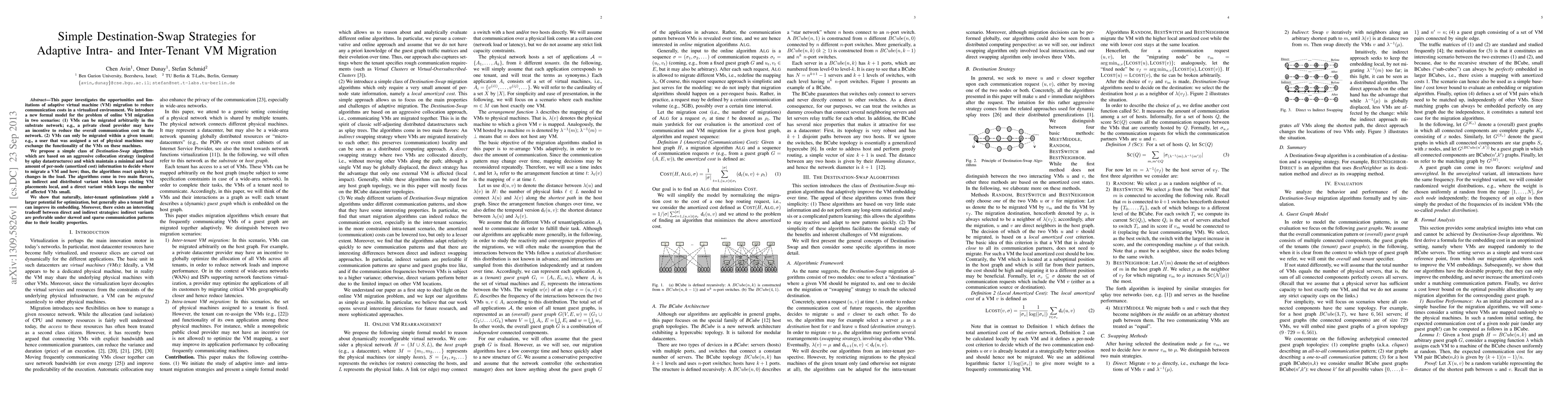 This paper proposes Destination-Swap algorithms for adaptive VM migration to minimize communication costs, introducing a minimal information strategy for quick response to load changes. It finds that inter-tenant migrations offer greater optimization potential, with indirect variants being preferable under skewed communication patterns.