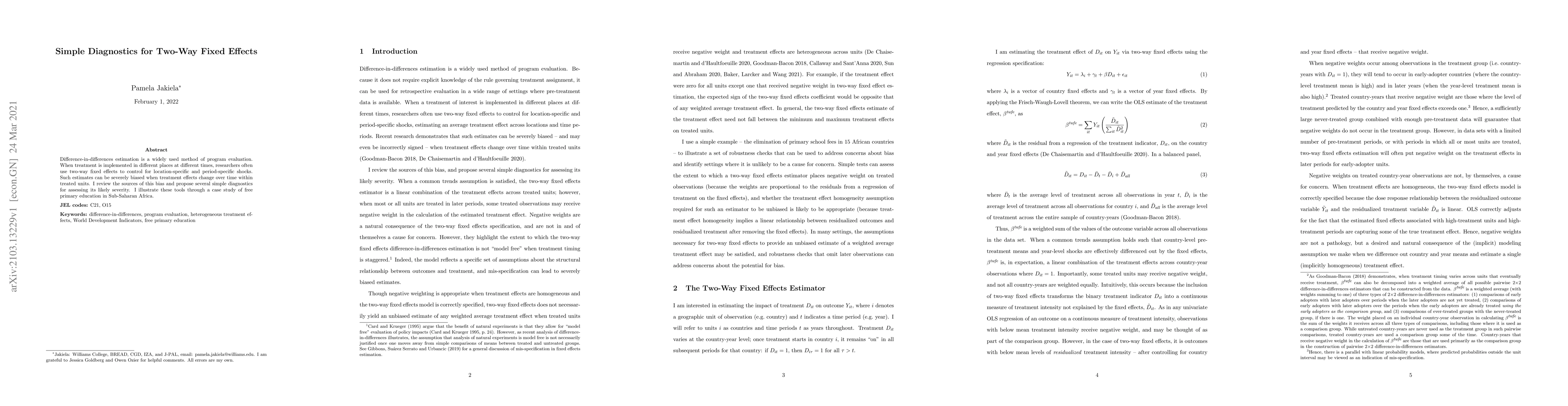 This paper reviews biases in two-way fixed effects models used in program evaluation and proposes simple diagnostic tools to assess the severity of such biases, illustrated with a case study on free primary education in Sub-Saharan Africa.