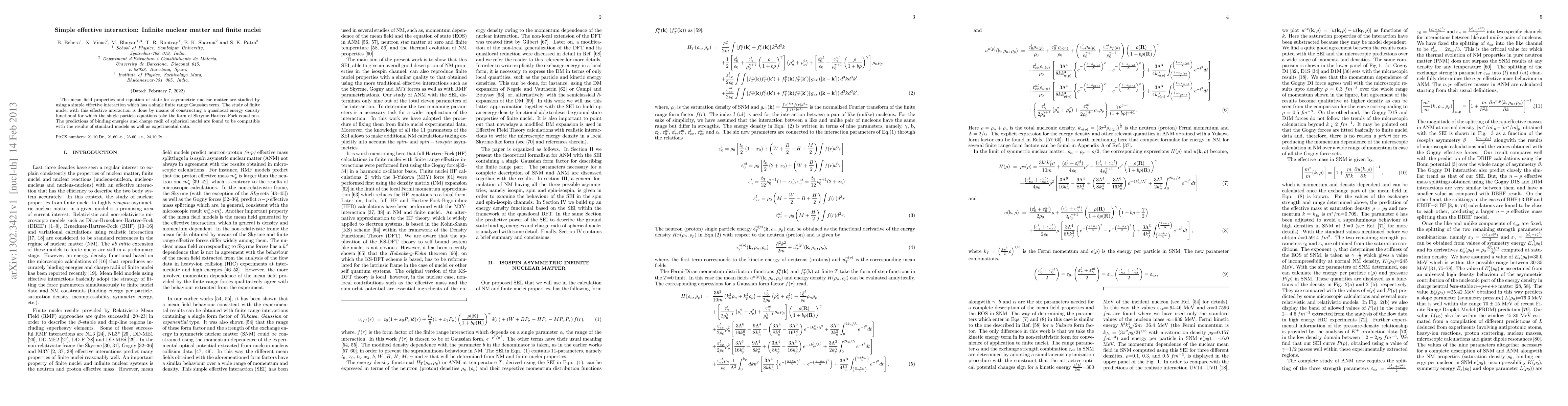 This paper investigates the mean field properties and equation of state of asymmetric nuclear matter using a simple effective interaction with a single finite range Gaussian term. The study also applies this interaction to finite nuclei, yielding predictions for binding energies and charge radii that align well with standard models and experimental data.