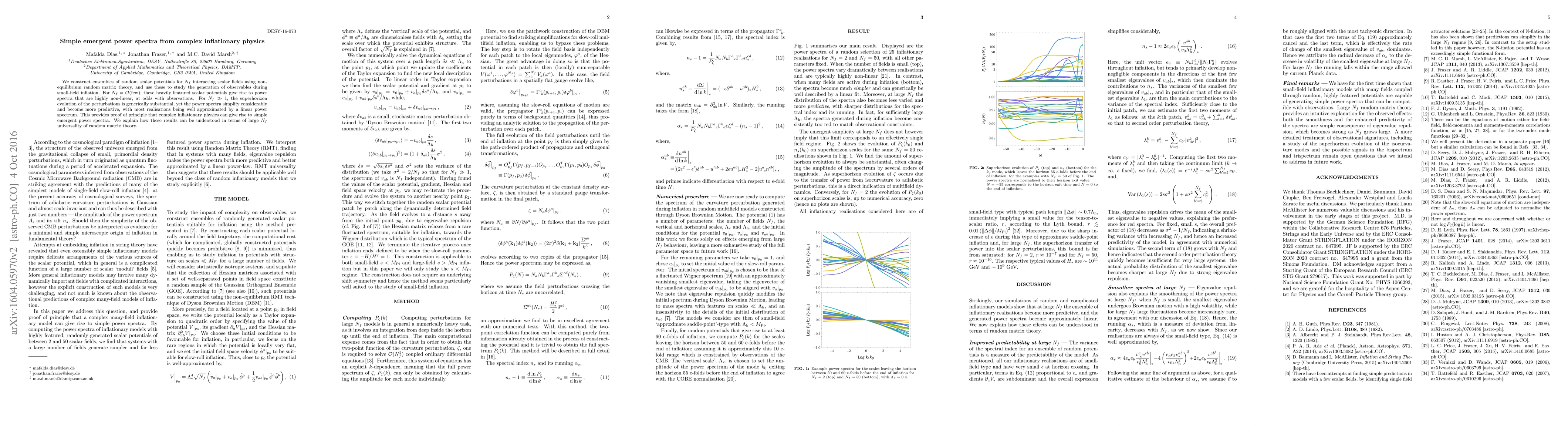 We construct ensembles of random scalar potentials for $N_f$ interacting scalar fields using non-equilibrium random matrix theory, and use these to study the generation of observables during small-field inflation. For $N_f={\cal O}({\rm few})$, these heavily featured scalar potentials give rise to power spectra that are highly non-linear, at odds with observations. For $N_f\gg 1$, the superhorizon evolution of the perturbations is generically substantial, yet the power spectra simplify considerably and become more predictive, with most realisations being well approximated by a linear power spectrum. This provides proof of principle that complex inflationary physics can give rise to simple emergent power spectra. We explain how these results can be understood in terms of large $N_f$ universality of random matrix theory.