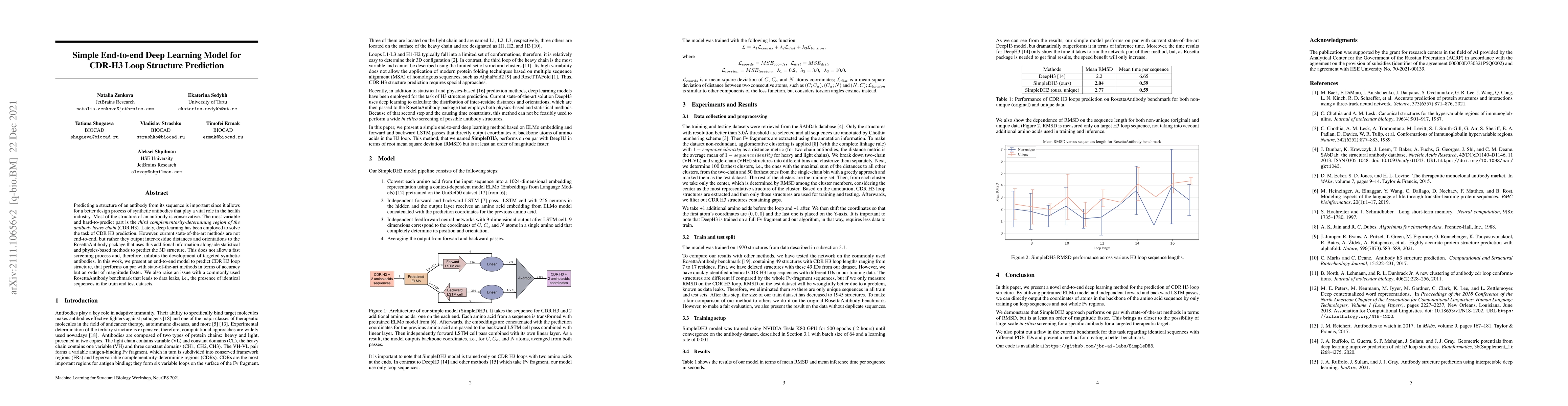 Predicting a structure of an antibody from its sequence is important since it allows for a better design process of synthetic antibodies that play a vital role in the health industry. Most of the structure of an antibody is conservative. The most variable and hard-to-predict part is the third complementarity-determining region of the antibody heavy chain (CDR H3). Lately, deep learning has been employed to solve the task of CDR H3 prediction. However, current state-of-the-art methods are not end-to-end, but rather they output inter-residue distances and orientations to the RosettaAntibody package that uses this additional information alongside statistical and physics-based methods to predict the 3D structure. This does not allow a fast screening process and, therefore, inhibits the development of targeted synthetic antibodies. In this work, we present an end-to-end model to predict CDR H3 loop structure, that performs on par with state-of-the-art methods in terms of accuracy but an order of magnitude faster. We also raise an issue with a commonly used RosettaAntibody benchmark that leads to data leaks, i.e., the presence of identical sequences in the train and test datasets.