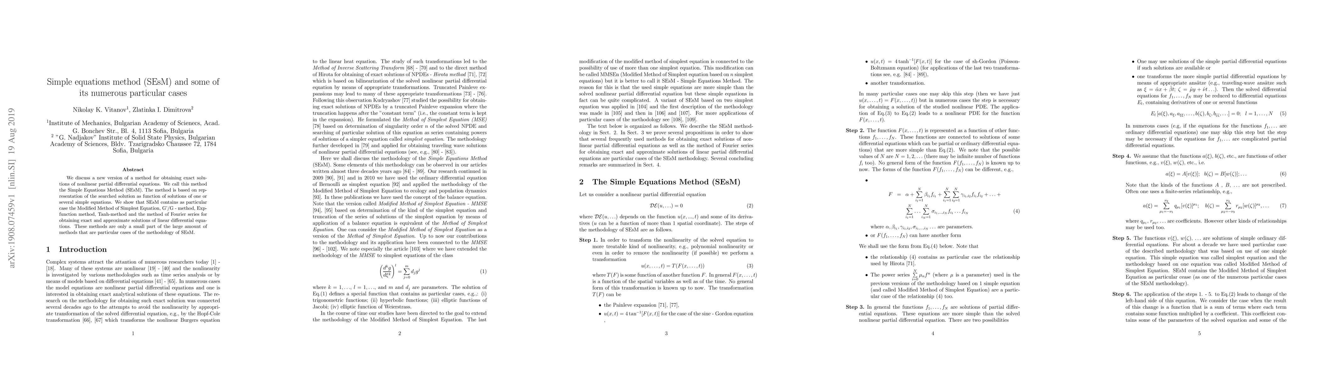 The Simple Equations Method (SEsM) offers a new approach to solving nonlinear partial differential equations by representing solutions as functions of simpler equations. SEsM encompasses several existing methods, including the Modified Method of Simplest Equation, G'/G-method, Exp-function method, Tanh-method, and Fourier series method.