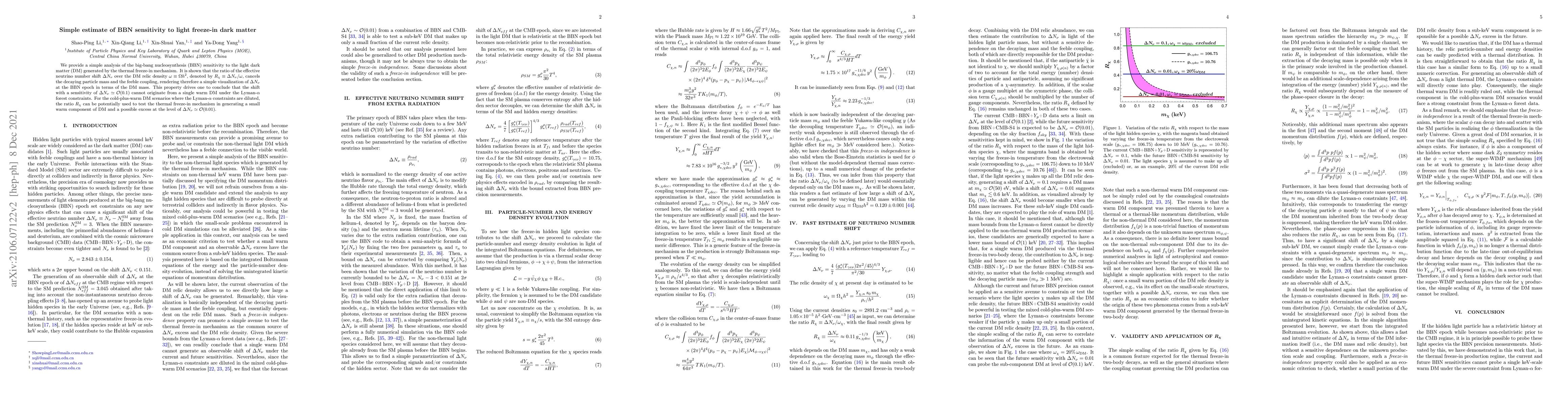 The paper provides a simple analysis using the big-bang nucleosynthesis (BBN) to estimate sensitivity to light dark matter (DM) generated by the thermal freeze-in mechanism, focusing on the ratio R_χ = ΔN_ν / ω, which cancels out the decaying particle mass and feeble coupling.