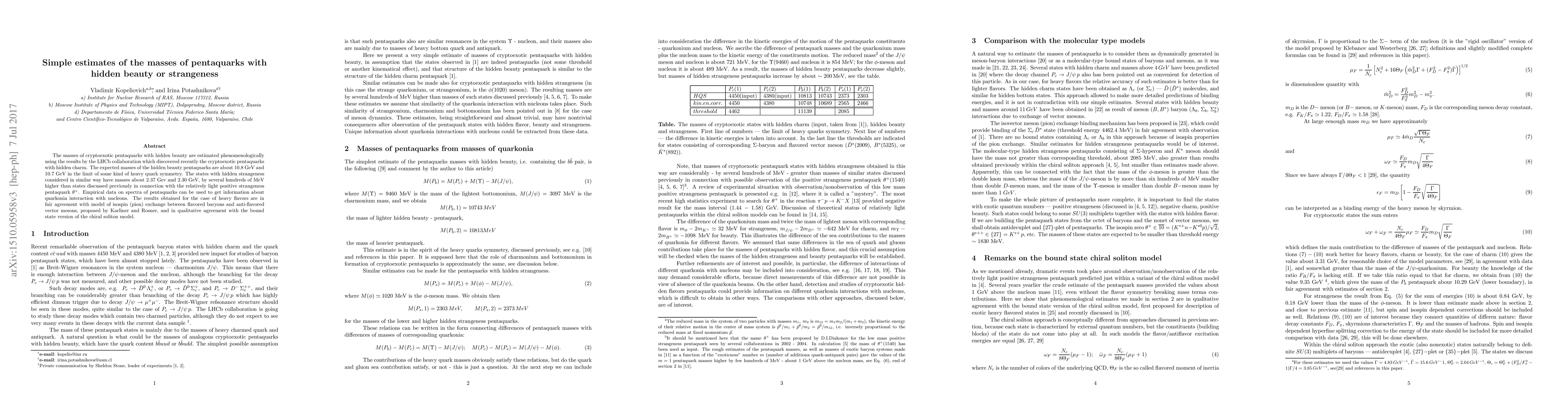 This paper estimates the masses of exotic pentaquarks with hidden beauty and strangeness, finding them to be around $10.8$ GeV and $10.7$ GeV for hidden beauty and $2.37$ GeV and $2.30$ GeV for hidden strangeness, using phenomenological methods and comparisons with existing models. The results align well with theoretical models of isospin exchange and the chiral soliton model, providing insights into quark interactions within these particles.