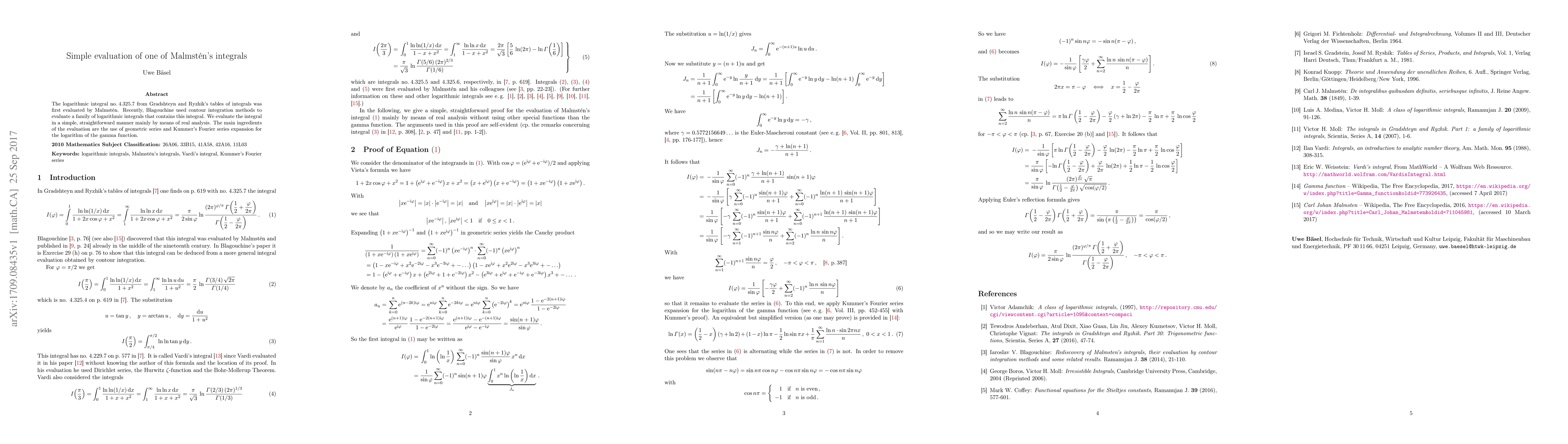 The logarithmic integral no. 4.325.7 from Gradshteyn and Ryzhik's tables of integrals was first evaluated by Malmst\'en. Recently, Blagouchine used contour integration methods to evaluate a family of logarithmic integrals that contains this integral. We evaluate the integral in a simple, straightforward manner mainly by means of real analysis. The main ingredients of the evaluation are the use of geometric series and Kummer's Fourier series expansion for the logarithm of the gamma function.