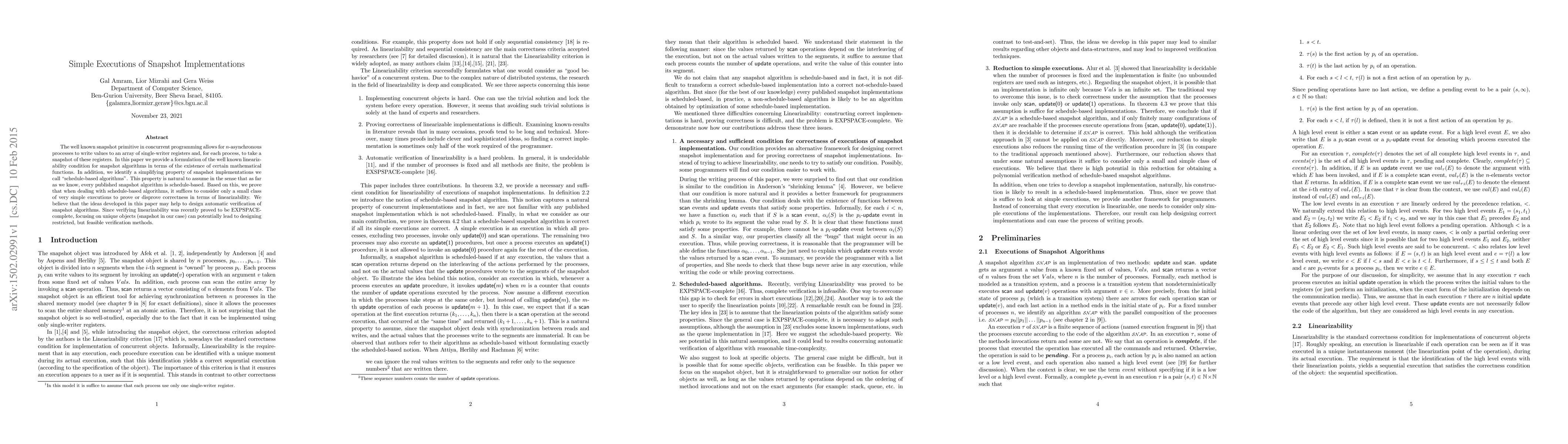 This paper formulates the linearizability condition for snapshot algorithms in terms of mathematical functions and introduces "schedule-based algorithms," a property believed to hold for all published snapshot algorithms. It demonstrates that verifying linearizability for these algorithms can be simplified by focusing on a small class of basic executions, potentially aiding in the design of feasible automatic verification methods.