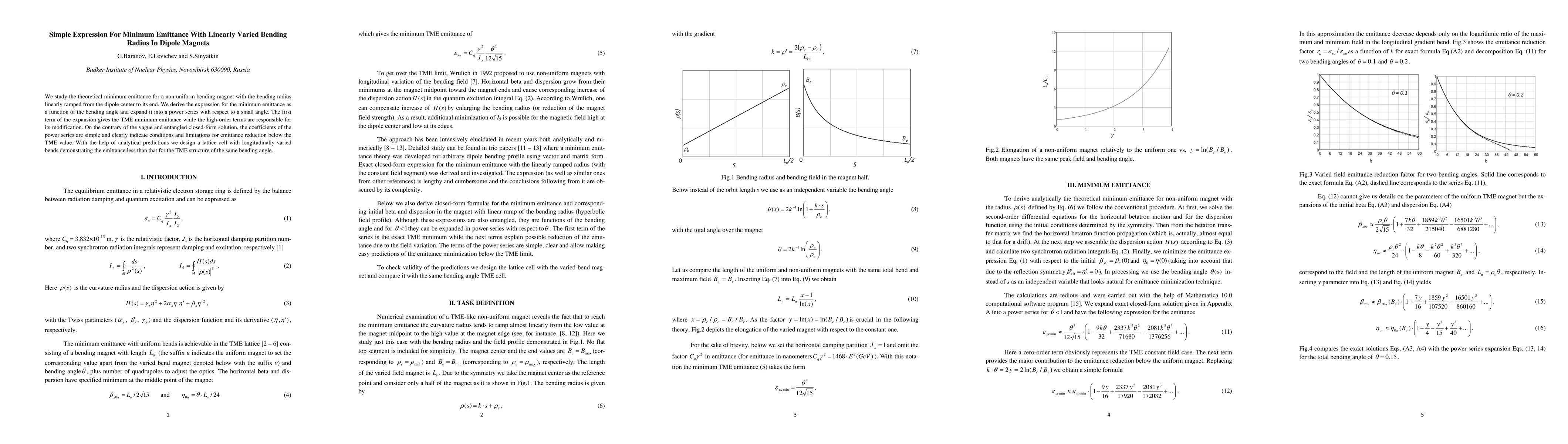 We study the theoretical minimum emittance for a non-uniform bending magnet with the bending radius linearly ramped from the dipole center to its end. We derive the expression for the minimum emittance as a function of the bending angle and expand it into a power series with respect to a small angle. The first term of the expansion gives the TME minimum emittance while the high-order terms are responsible for its modification. On the contrary of the vague and entangled closed-form solution, the coefficients of the power series are simple and clearly indicate conditions and limitations for emittance reduction below the TME value. With the help of analytical predictions we design a lattice cell with longitudinally varied bends demonstrating the emittance less than that for the TME structure of the same bending angle.