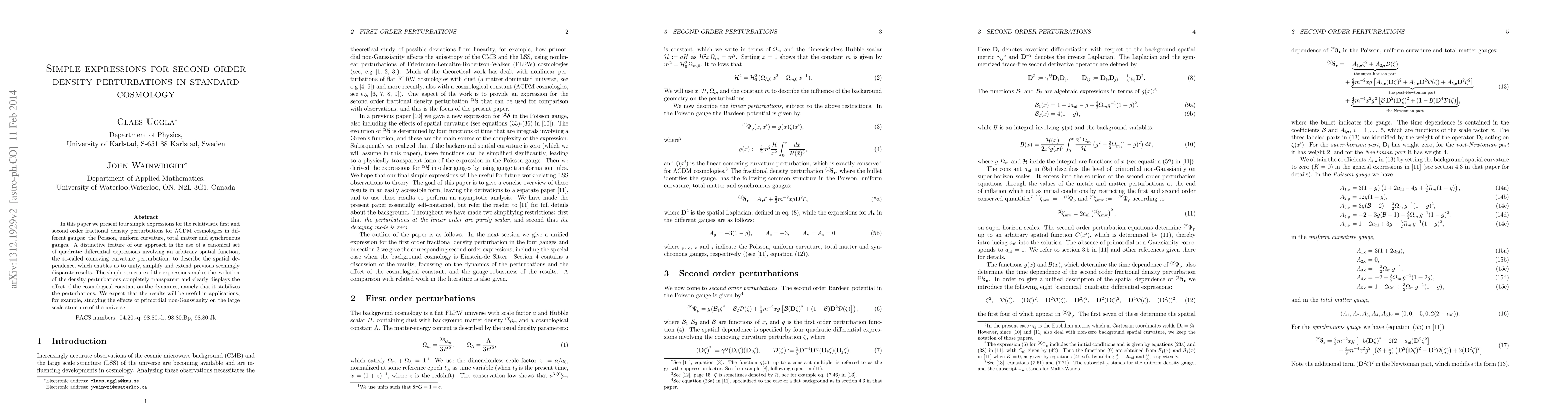 In this paper we present four simple expressions for the relativistic first and second order fractional density perturbations for $\Lambda$CDM cosmologies in different gauges: the Poisson, uniform curvature, total matter and synchronous gauges. A distinctive feature of our approach is the use of a canonical set of quadratic differential expressions involving an arbitrary spatial function, the so-called comoving curvature perturbation, to describe the spatial dependence, which enables us to unify, simplify and extend previous seemingly disparate results. The simple structure of the expressions makes the evolution of the density perturbations completely transparent and clearly displays the effect of the cosmological constant on the dynamics, namely that it stabilizes the perturbations. We expect that the results will be useful in applications, for example, studying the effects of primordial non-Gaussianity on the large scale structure of the universe.