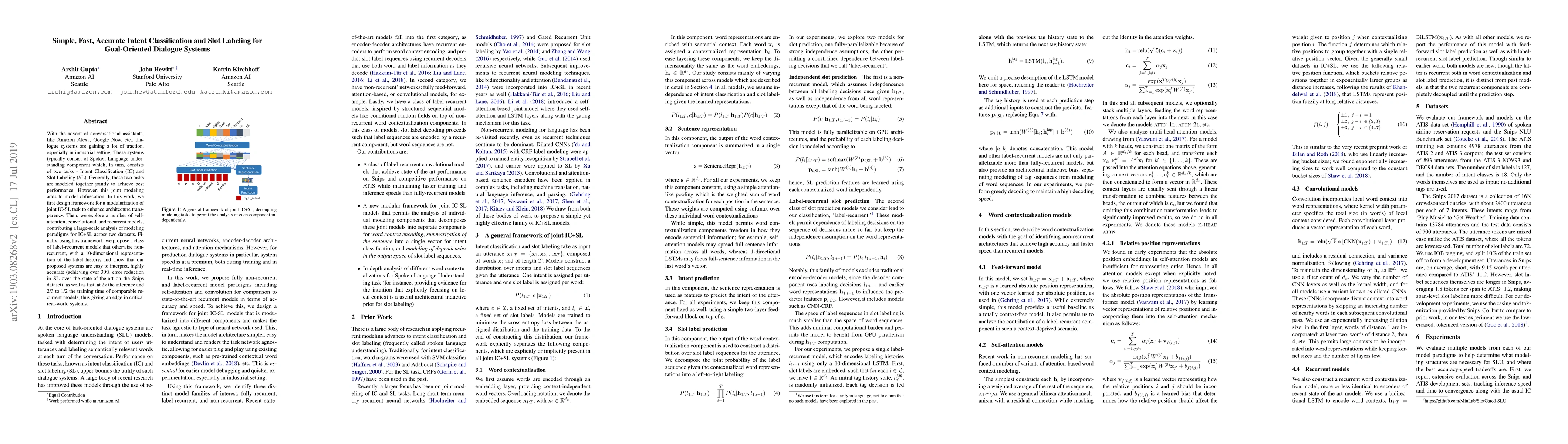 With the advent of conversational assistants, like Amazon Alexa, Google Now, etc., dialogue systems are gaining a lot of traction, especially in industrial setting. These systems typically consist of Spoken Language understanding component which, in turn, consists of two tasks - Intent Classification (IC) and Slot Labeling (SL). Generally, these two tasks are modeled together jointly to achieve best performance. However, this joint modeling adds to model obfuscation. In this work, we first design framework for a modularization of joint IC-SL task to enhance architecture transparency. Then, we explore a number of self-attention, convolutional, and recurrent models, contributing a large-scale analysis of modeling paradigms for IC+SL across two datasets. Finally, using this framework, we propose a class of 'label-recurrent' models that otherwise non-recurrent, with a 10-dimensional representation of the label history, and show that our proposed systems are easy to interpret, highly accurate (achieving over 30% error reduction in SL over the state-of-the-art on the Snips dataset), as well as fast, at 2x the inference and 2/3 to 1/2 the training time of comparable recurrent models, thus giving an edge in critical real-world systems.