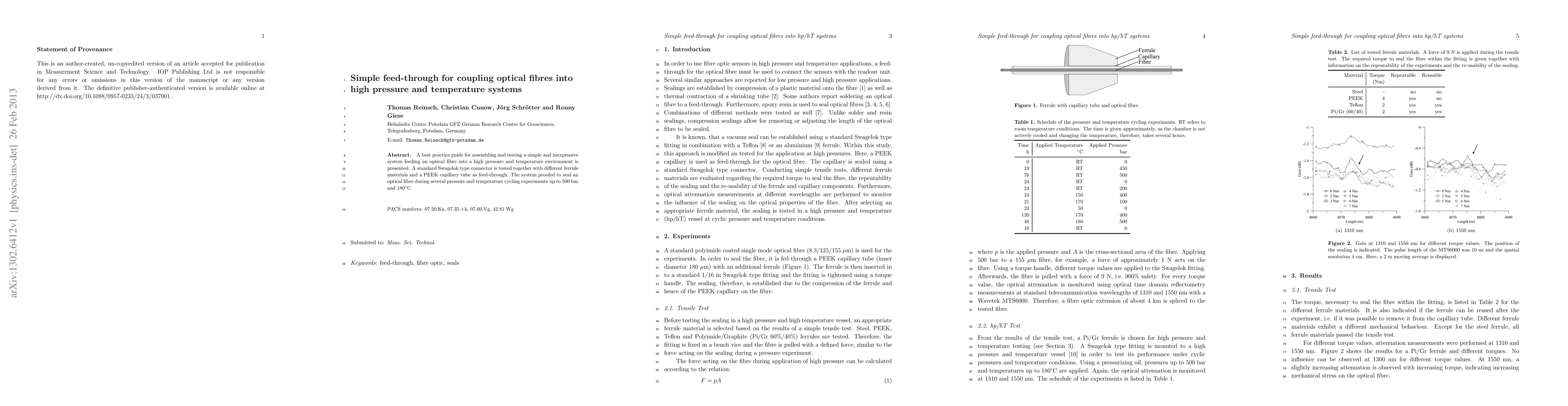 A best practice guide for assembling and testing a simple and inexpensive system feeding an optical fibre into a high pressure and temperature environment is presented. A standard Swagelok type connector is tested together with different ferrule materials and a PEEK capillary tube as feed-through. The system proofed to seal an optical fibre during several pressure and temperature cycling experiments up to 500 bar and 180{\deg}C.