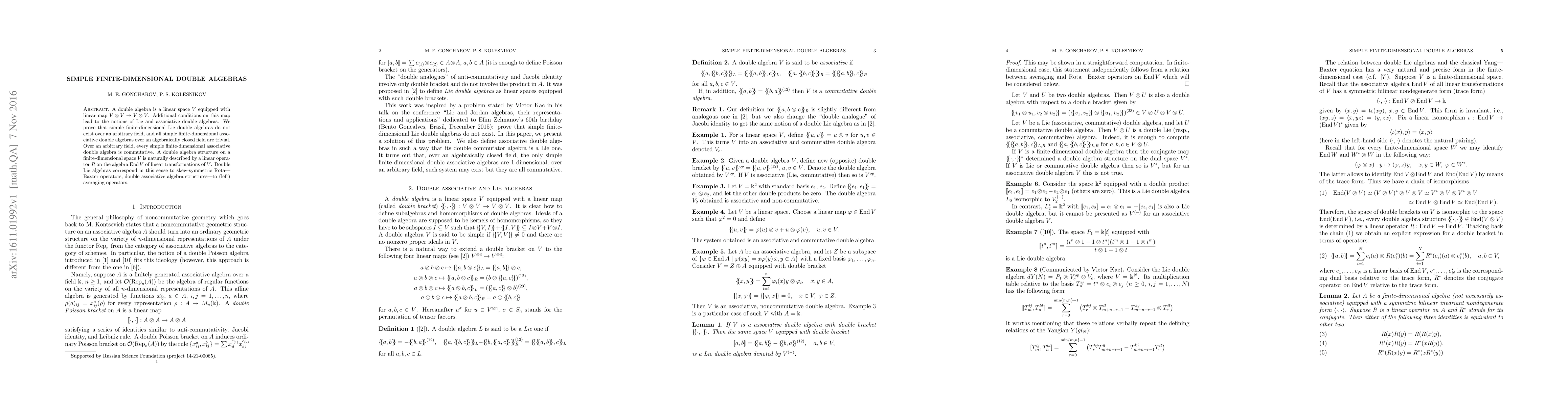 A double algebra is a linear space $V$ equipped with linear map $V\otimes V\to V\otimes V$. Additional conditions on this map lead to the notions of Lie and associative double algebras. We prove that simple finite-dimensional Lie double algebras do not exist over an arbitrary field, and all simple finite-dimensional associative double algebras over an algebraically closed field are trivial. Over an arbitrary field, every simple finite-dimensional associative double algebra is commutative. A double algebra structure on a finite-dimensional space $V$ is naturally described by a linear operator $R$ on the algebra $\End V$ of linear transformations of~$V$. Double Lie algebras correspond in this sense to skew-symmetric Rota---Baxter operators, double associative algebra structures---to (left) averaging operators.