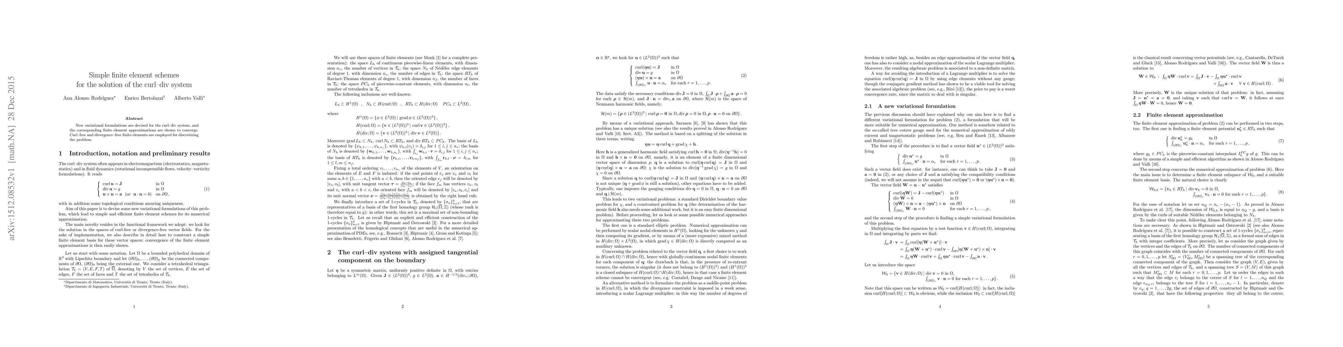 New variational formulations are devised for the curl--div system, and the corresponding finite element approximations are shown to converge. Curl--free and divergence--free finite elements are employed for discretizing the problem.