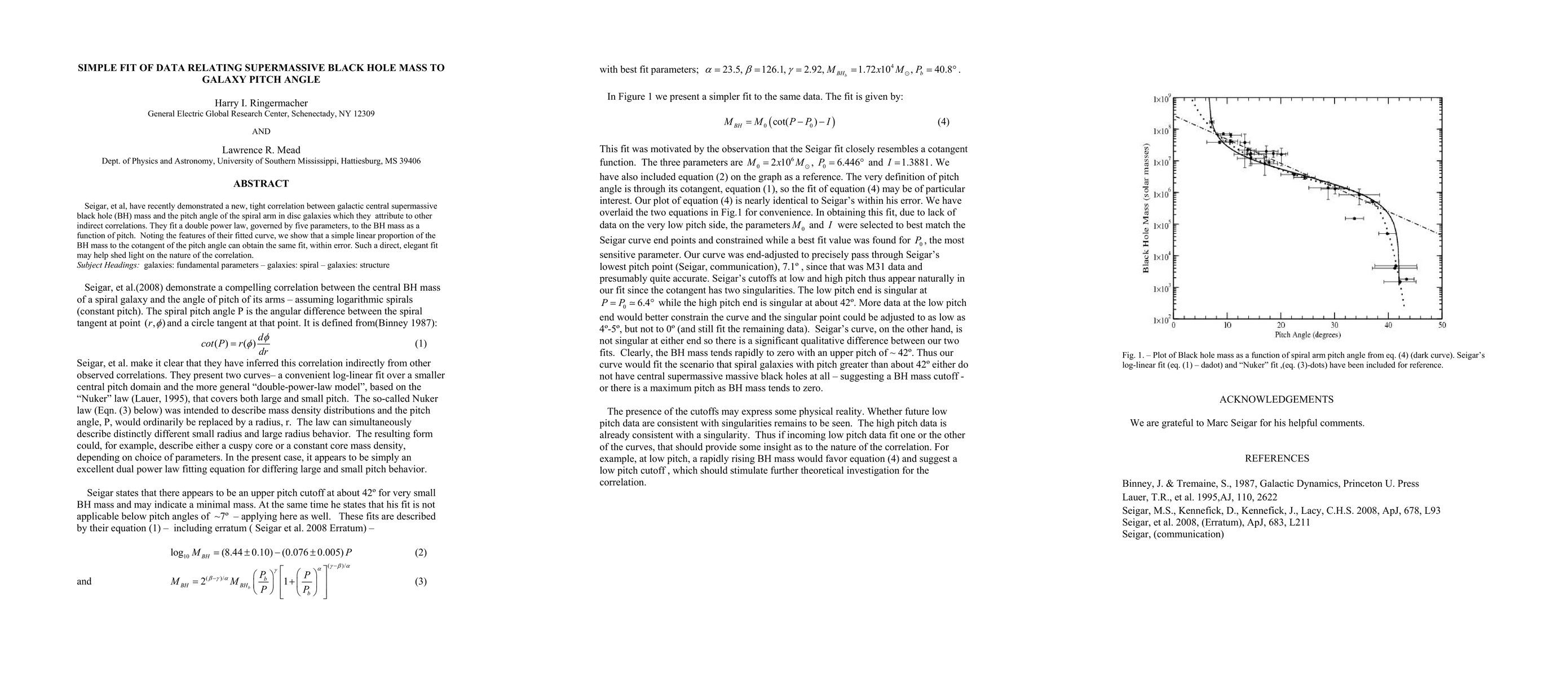 Seigar, et al, have recently demonstrated a new, tight correlation between galactic central supermassive black hole (BH) mass and the pitch angle of the spiral arm in disc galaxies which they attribute to other indirect correlations. They fit a double power law, governed by five parameters, to the BH mass as a function of pitch. Noting the features of their fitted curve, we show that a simple linear proportion of the BH mass to the cotangent of the pitch angle can obtain the same fit, within error. Such a direct, elegant fit may help shed light on the nature of the correlation.