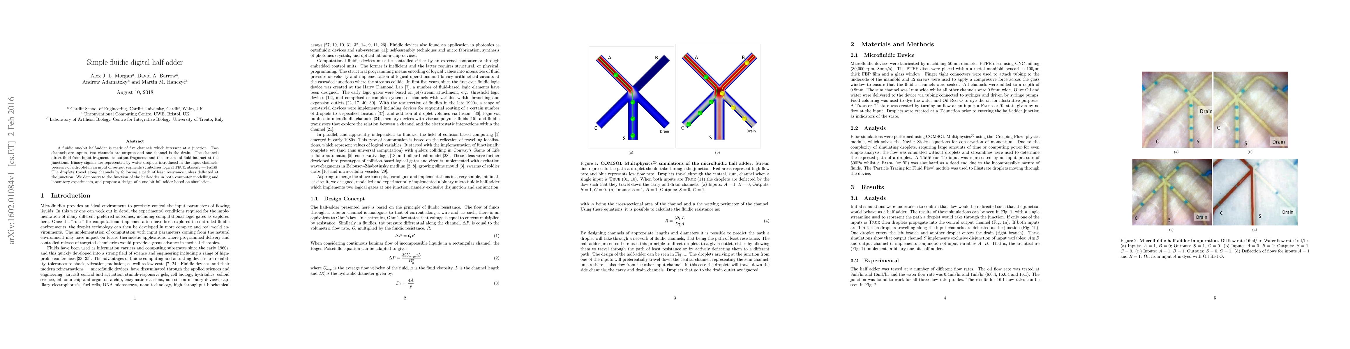 This research presents a fluidic one-bit half-adder using five intersecting channels to direct water droplets representing binary signals, demonstrating its functionality through computer modeling and laboratory experiments. The study proposes a design for a one-bit full adder based on the half-adder simulation.