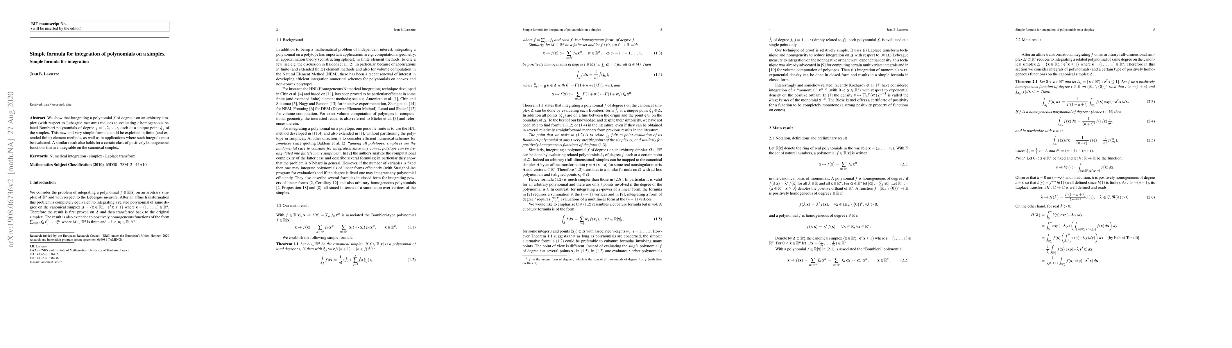 This paper presents a straightforward formula for integrating polynomials of degree t on a simplex by evaluating t homogeneous polynomials at unique points within the simplex. This method simplifies computations in finite element methods and other applications requiring such integrals.