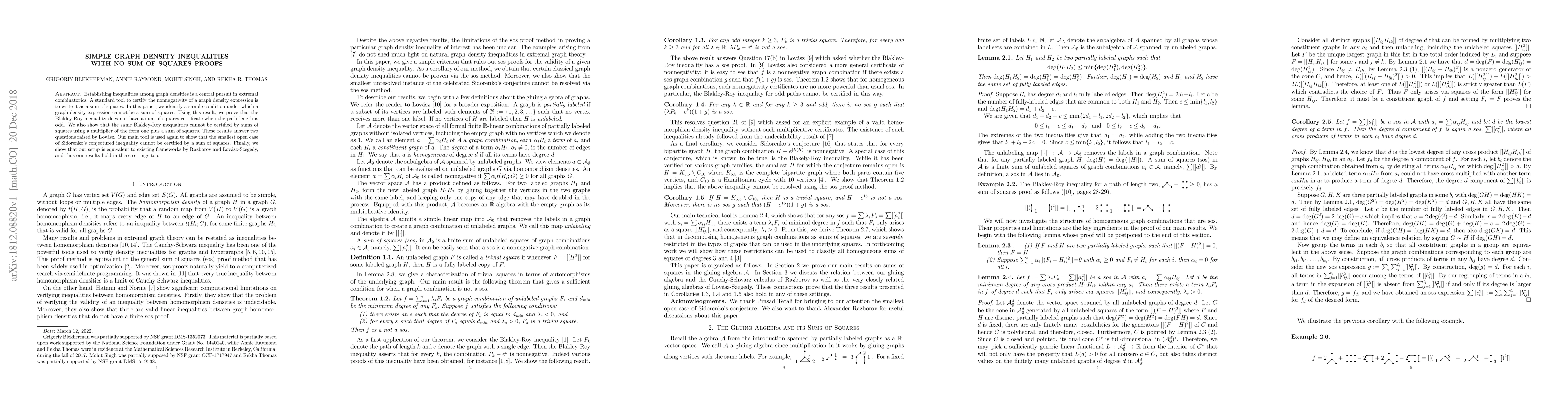Establishing inequalities among graph densities is a central pursuit in extremal combinatorics. A standard tool to certify the nonnegativity of a graph density expression is to write it as a sum of squares. In this paper, we identify a simple condition under which a graph density expression cannot be a sum of squares. Using this result, we prove that the Blakley-Roy inequality does not have a sum of squares certificate when the path length is odd. We also show that the same Blakley-Roy inequalities cannot be certified by sums of squares using a multiplier of the form one plus a sum of squares. These results answer two questions raised by Lov\'asz. Our main tool is used again to show that the smallest open case of Sidorenko's conjectured inequality cannot be certified by a sum of squares. Finally, we show that our setup is equivalent to existing frameworks by Razborov and Lov\'asz-Szegedy, and thus our results hold in these settings too.