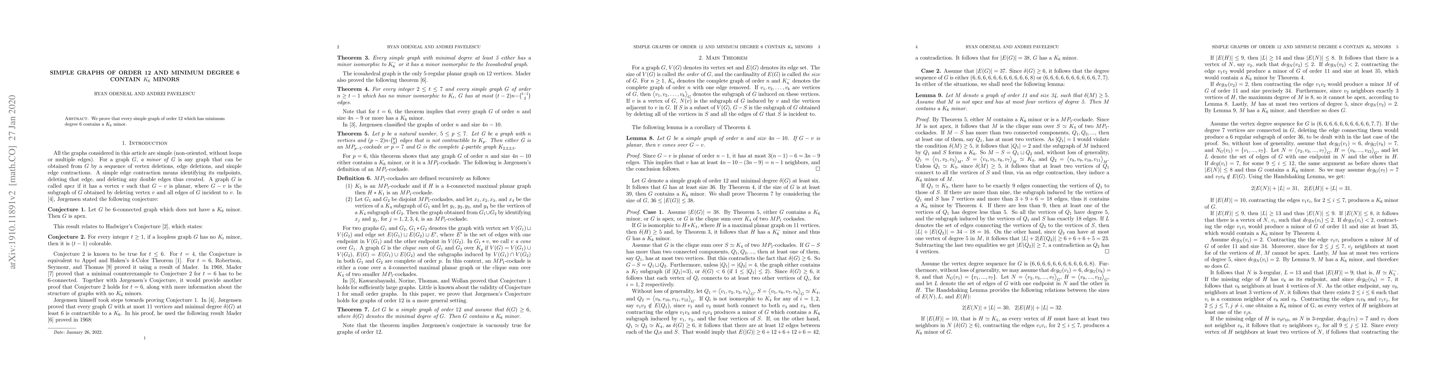 Summary: This paper demonstrates that any simple graph with 12 vertices and a minimum degree of 6 necessarily contains a K_6 minor. The result highlights a structural property of such graphs.