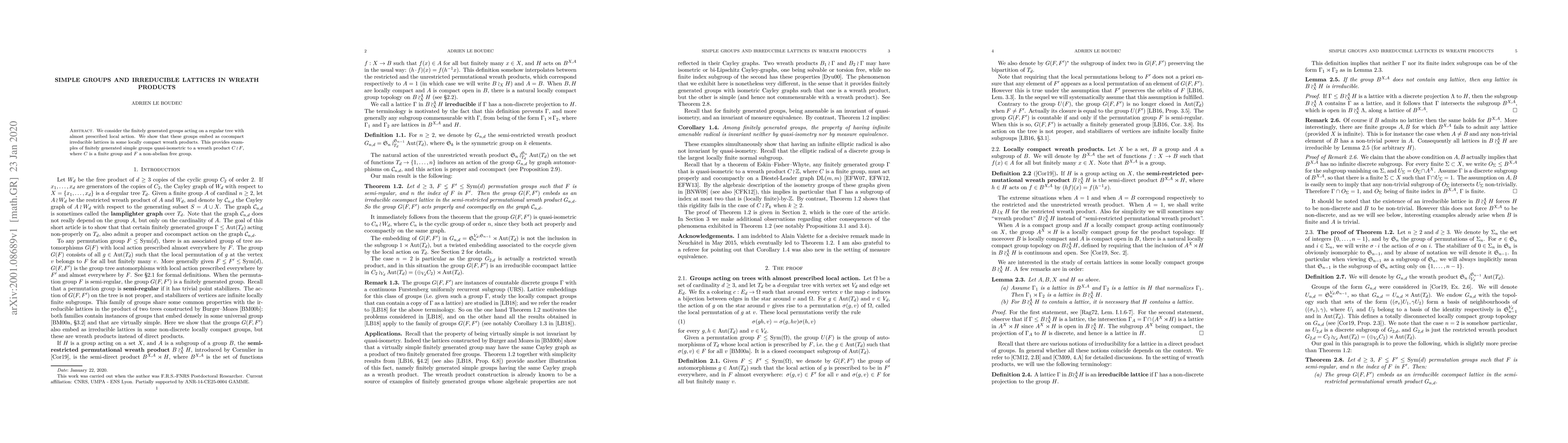 This paper demonstrates that certain finitely generated groups acting on a regular tree can be embedded as cocompact irreducible lattices in locally compact wreath products, providing examples of finitely generated simple groups quasi-isometric to wreath products of a finite group and a non-abelian free group.