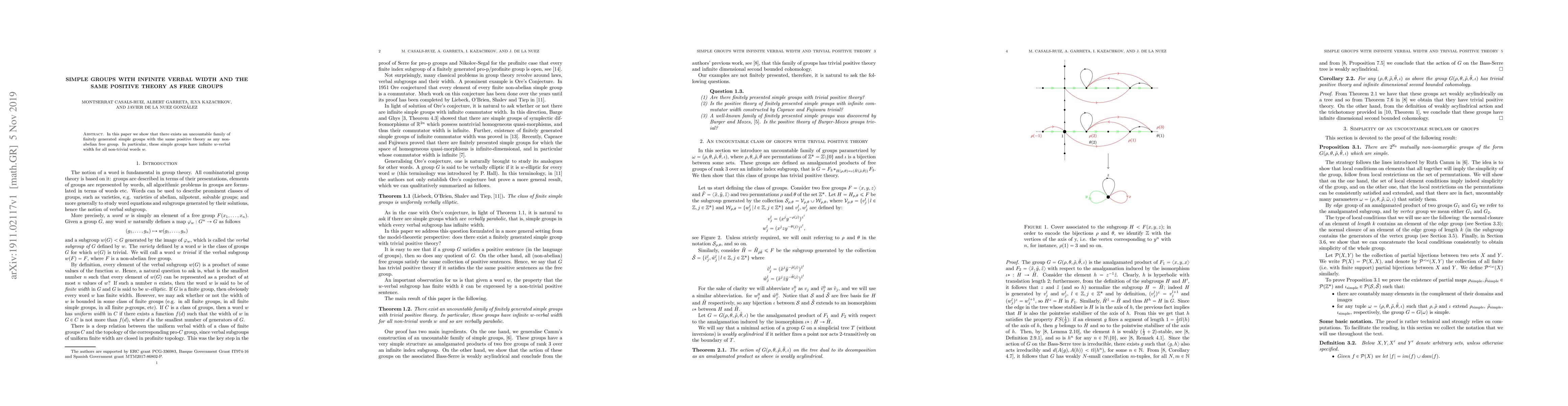 Researchers have discovered a family of finitely generated simple groups with infinite verbal width, sharing the same positive theory as non-abelian free groups.